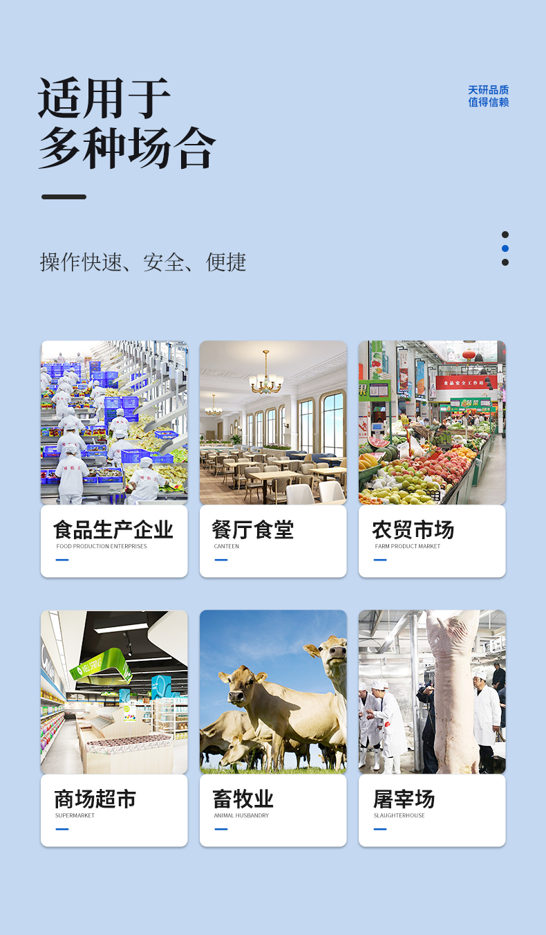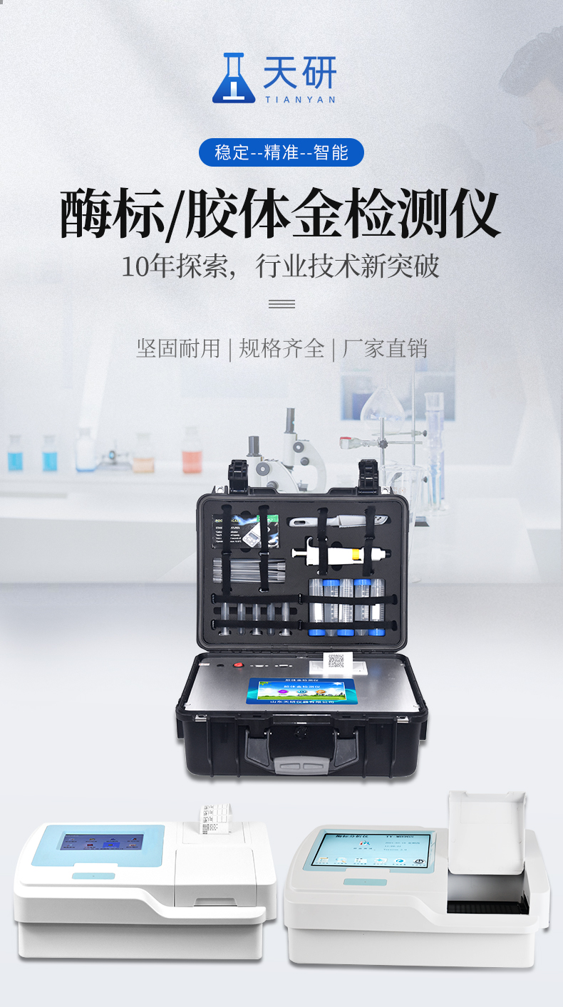 該膠體金檢測儀適用于豬、雞、鴨、羊、牛、牛奶等畜禽肉產(chǎn)品中獸藥殘留,包括抗生素類殘留、瘦肉精激素類殘留和水產(chǎn)品有毒有害物質(zhì)的現(xiàn)場快速篩查定及性定量檢測。 該多功能獸藥殘留檢測儀為集成化肉品安全快速檢測分析設(shè)備,可廣泛應(yīng)用于畜牧養(yǎng)殖場、屠宰場、食品肉產(chǎn)品深加工企業(yè)、食藥監(jiān)局、檢驗(yàn)檢疫部門、衛(wèi)生部門、高教院校、科研院所、農(nóng)業(yè)部門等單位使用。