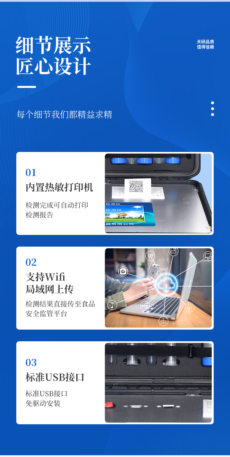 | 安卓智能操作系統(tǒng),采用更加**UI交互界面,儀器具有wifi聯(lián)網(wǎng)上傳、4G聯(lián)網(wǎng)傳輸、GPRS無線遠(yuǎn)傳、網(wǎng)線連接功能,快速批量上傳數(shù)據(jù)。 | 智能化程度高,儀器具有自檢功能:具有開機(jī)自檢和調(diào)零功能,具有自動(dòng)檢測重復(fù)性功能。 | 新一代高速熱敏打印機(jī),檢測完成可自動(dòng)打印檢測報(bào)告和二維碼。 | 儀器帶有監(jiān)管平臺,數(shù)據(jù)可局域網(wǎng)和互聯(lián)網(wǎng)數(shù)據(jù)上傳,檢測結(jié)果直接傳至食品安全監(jiān)管平臺。進(jìn)行區(qū)域食品安全監(jiān)管及大數(shù)據(jù)分析處理與數(shù)據(jù)統(tǒng)計(jì),檢測區(qū)域食品安全長短期動(dòng)態(tài),達(dá)到食品安全問題預(yù)估、預(yù)警 | 一體化便攜式快檢設(shè)備,滿足現(xiàn)場及流動(dòng)檢測使用需求,能夠在同一軟件下實(shí)現(xiàn)所有檢測項(xiàng)目的檢測,并可通過同一窗口直觀顯示檢測結(jié)果。 | 膠體金模塊檢測方式:軌道式自動(dòng)傳輸掃描,檢測完成后自動(dòng)退出檢測卡。 | 一體化主機(jī),包含食品安全檢測模塊、多通道農(nóng)藥殘留檢測模塊、膠體金免疫層析檢測模塊。 | CT線自動(dòng)識別,無需手動(dòng)調(diào)整。 | 儀器具有品類多種類樣品菜單庫,可靈活選擇檢測樣品,不同的檢測通道可同時(shí)檢測不同的樣品項(xiàng)目。。 | 樣品處理簡單省力,整體操作快速、安全、便捷。 | 儀器具有自身保護(hù)功能,可設(shè)置用戶名及密碼,防止非工作人員操作等。 | 高靈敏度,高檢測精度,高重復(fù)性精度,掃描式高精度光學(xué)傳感器。 | 儀器具有重新校準(zhǔn)、鎖定、恢復(fù)出廠設(shè)置功能。 | 內(nèi)置強(qiáng)大的數(shù)據(jù)庫,可在儀器上直接選擇樣品名稱、檢測指標(biāo)、送檢單位等信息,也可在儀器上直接編輯錄入樣品名稱、檢測指標(biāo)、送檢單位等信息并保存進(jìn)樣品數(shù)據(jù)庫。 | 儀器具有重新校準(zhǔn)、鎖定、恢復(fù)出廠設(shè)置功能。 | 結(jié)果判定線可修改,對照值標(biāo)定值可保存,斷電不丟失數(shù)據(jù)。 | 兼容市場上所有的膠體金卡,使用耗材不受限制,極大增強(qiáng)用戶使用體驗(yàn)。 |