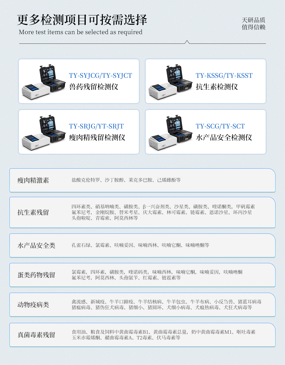 | 食品添加劑:二氧化硫、雙氧水、亞硝酸鹽、硝酸鹽、苯甲酸鈉、山梨酸鉀、糖精鈉、甜蜜素、木耳硫酸鎂等 | 有毒有害物質(zhì):甲醛、吊白塊、硼砂、過氧化苯甲酰、溴酸鉀、羅丹明B、三聚氰胺、蘇丹紅、工業(yè)堿、尿素、明礬等 | 果蔬:農(nóng)藥殘留(酶抑制率法) | 病害肉診斷:組胺、揮發(fā)性鹽基氮; | 重金屬含量:鉛、鎘、鉻、汞、砷、錫、鎳、鋁等; | 食用油脂: 過氧化值、酸價等 | 瘦肉精激素類(獸藥):鹽酸克倫特羅、沙丁胺醇、萊克多巴胺、己烯雌酚等 | 抗生素殘留類(獸藥):四環(huán)素類、硝基呋喃類、磺胺類、β-興奮劑類、沙星類、磺胺類、喹諾酮類,甲砜霉素,氟苯尼考,金剛烷胺、替米考星、慶大霉素、林可霉素、鏈霉素、恩諾沙星、環(huán)丙沙星、頭孢啦啶、青霉素、阿莫西林等 | 真菌毒素類:食用油、糧食及飼料中黃曲霉毒素B1、黃曲霉毒素總量,奶中黃曲霉毒素M1、嘔吐毒素、玉米赤霉烯酮、赭曲霉毒素A、T2毒素、伏馬毒素等; | 水酒飲品分析:酒中甲醇、乙醇、乳品及牛奶中蛋白質(zhì), | 調(diào)味品成分:食醋的總酸、醬油的總酸、芝麻油純度、谷氨酸鈉、醬油氨基酸態(tài)氮、食鹽中亞鐵氰化鉀、食鹽中碘等 | 食用色素類:紅色色素(胭脂紅、莧菜紅、赤蘚紅、誘惑紅)、黃色色素(檸檬黃、日落黃)、藍(lán)色色素(亮藍(lán))等 | 動物疫病類:禽流感、新城疫、牛羊口蹄疫、牛羊結(jié)核病、牛羊包蟲、牛羊布病、小反芻獸、豬藍(lán)耳病毒、豬瘟病毒、豬偽狂犬病毒、豬細(xì)小、豬圓環(huán)、犬細(xì)小病毒、犬瘟熱病毒、犬狂犬病毒等; | 蜂蜜成分:果糖和葡萄糖、蔗糖、淀粉酶、酸度等 | 水產(chǎn)品安全類:孔雀石綠、氯霉素、呋喃妥因、呋喃西林、呋喃它酮、呋喃唑酮等 | 蛋類藥物殘留:氯霉素,四環(huán)素,磺胺類,喹諾酮類,呋喃西林,呋喃它酮,呋喃妥因,呋喃唑酮,氟苯尼考,阿莫西林、頭孢氨芐、紅霉素、鏈霉素等 |
