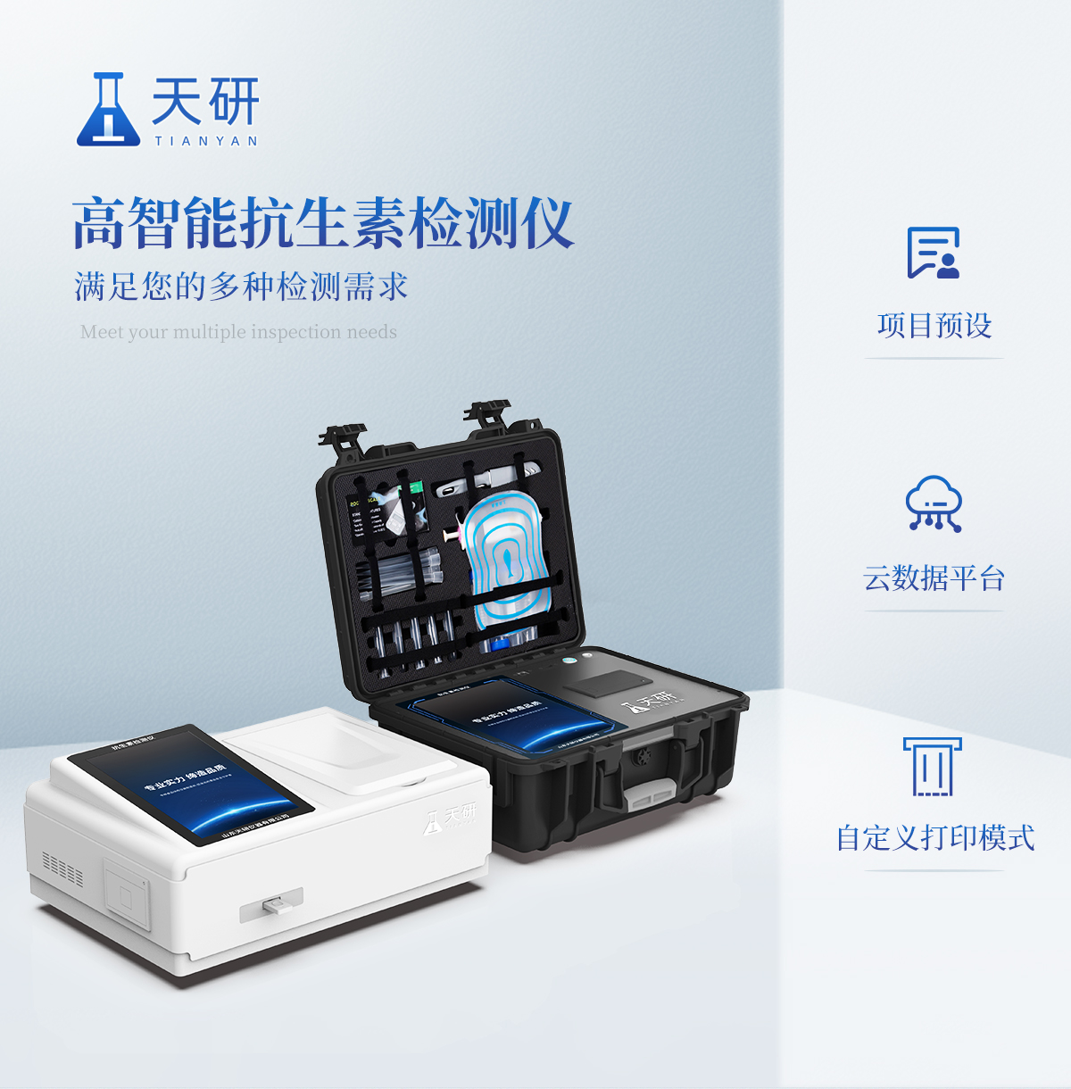 山東天研儀器有限公司生產(chǎn)的箱式抗生素檢測儀為集成化食品安全快速檢測分析設(shè)備,采用臺式一體化設(shè)計(jì),可快速檢測200多種食品安全項(xiàng)目,包含非食用化學(xué)物質(zhì)、濫用食品添加劑、農(nóng)藥殘留、獸藥殘留、重金屬、病害肉、營養(yǎng)強(qiáng)化劑、抗生素類殘留、激素類殘留、真菌毒素類殘留、化學(xué)類殘留等項(xiàng)目的定性定量檢測。該高智能食品安全檢測儀為集成化食品安全快速檢測分析設(shè)備,目前已于食藥監(jiān)局、衛(wèi)生部門、高教院校、科研院所、農(nóng)業(yè)部門、養(yǎng)殖場、屠宰場、食品肉產(chǎn)品深加工企業(yè)及檢驗(yàn)檢疫部門等單位廣泛使用。