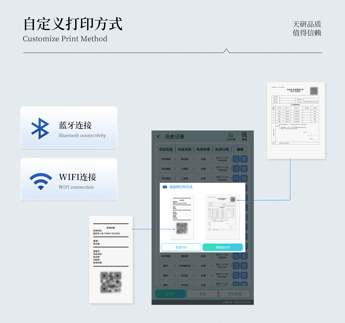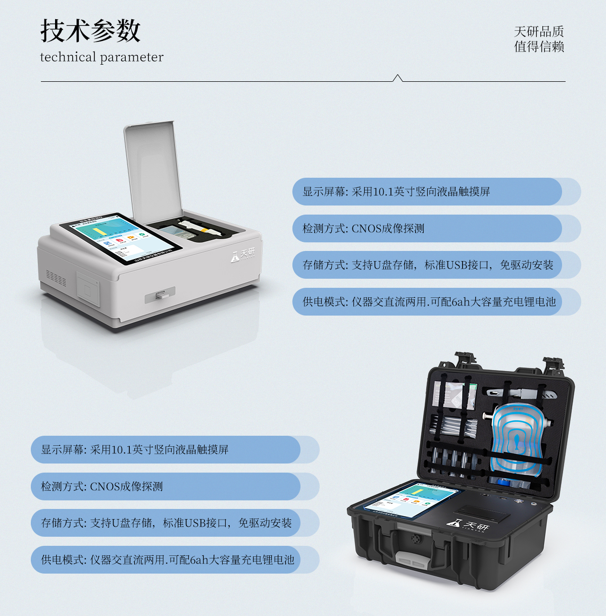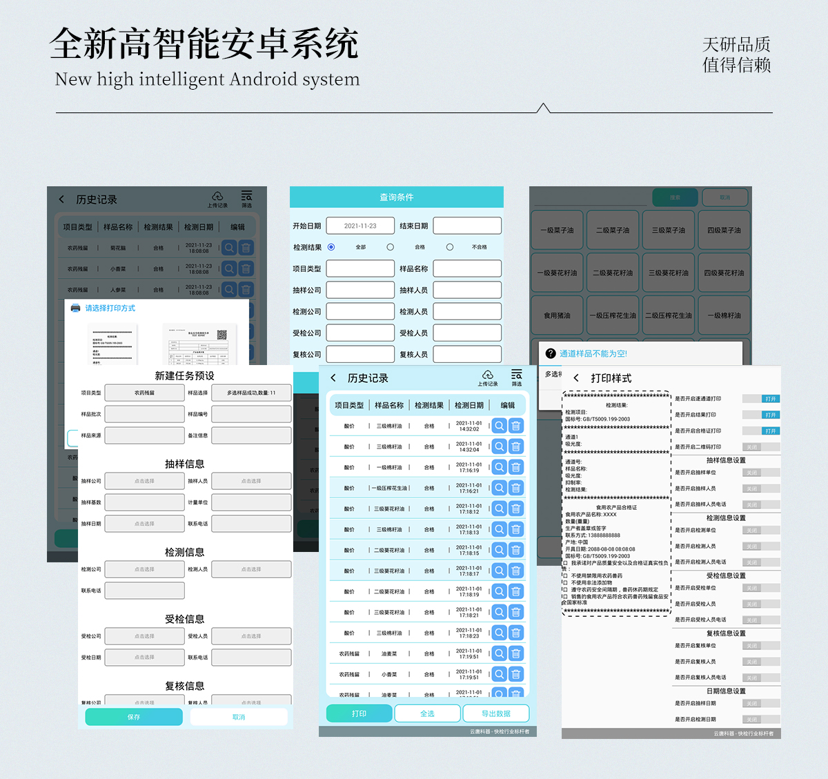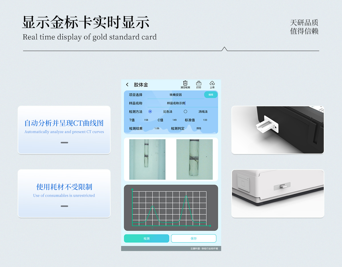 | 儀器采用手提一體化系統(tǒng)檢測技術(shù),將分光光度模塊、膠體金檢測模塊、新型農(nóng)殘檢測模塊、數(shù)字化管理模塊、無線通訊模塊高度集成于一體,支持檢測200種食品安全檢測項(xiàng)目,同時預(yù)留升級檢測方法。 | 儀器檢測模塊標(biāo)準(zhǔn)化、智能化,檢測項(xiàng)目可隨意自由組合。檢測箱體內(nèi)置多個標(biāo)準(zhǔn)檢測單元,檢測模塊可以調(diào)整配置。 | 顯示屏幕:儀器采用10.1英寸豎向液晶觸摸屏顯,搭配運(yùn)行安卓智能操作系統(tǒng),主控芯片采用ARM Cortex-A7,RK3288/4核處理器,主頻1.88Ghz,操作方便,性能更強(qiáng)。 | 檢測通道:≥12通道;采用精密旋轉(zhuǎn)比色池設(shè)計(jì),使用同芯片同光源校準(zhǔn)精度,解決不同光源之間的誤差值,更加準(zhǔn)確**。(1-12通道間誤差0.1%,**號:ZL202022821055.2) | 儀器光源:高精度進(jìn)口四波長冷光源,每個通道均配置 410、520、590、630nm 波長光源,標(biāo)配**的光路切換裝置,**光路切換功能可實(shí)現(xiàn)64波長,并且所有檢測項(xiàng)目可實(shí)現(xiàn)所有通道同時檢測。 | 設(shè)備可一鍵校準(zhǔn),自動保存校準(zhǔn)數(shù)據(jù),自動對比校驗(yàn),得到精準(zhǔn)光源,采用Android SP存儲數(shù)據(jù),光源數(shù)據(jù)永不丟失,方便每一次使用。 | 通訊接口:配備無線通信模塊、4G(APN)通訊模塊、藍(lán)牙傳輸,同時具有雙USB接口以及RJ45網(wǎng)線接口,可以多方式實(shí)現(xiàn)數(shù)據(jù)保存及數(shù)據(jù)傳輸。 | 存儲方式:支持U盤存儲,標(biāo)準(zhǔn)USB接口,免驅(qū)動安裝。檢測結(jié)果存儲容量20萬條以上,可生成Excel表格進(jìn)行拷貝,并具有登錄保護(hù)功能。 | 智能化操作系統(tǒng):: ★操作系統(tǒng):儀器可在同一檢測界面自動對應(yīng)相關(guān)檢測通道,一次性選擇1-12個樣品名稱,無需退出界面,節(jié)省操作時間。并可以對每個通道屬性和樣品信息單獨(dú)進(jìn)行編輯,例如送檢單位、人員,檢測人員等,打印時勾選打印顯示。 | ★數(shù)據(jù)集成系統(tǒng):設(shè)備首頁自動匯總分析檢測數(shù)據(jù),包含:周檢測數(shù)據(jù)、月檢測數(shù)據(jù),全部檢測總數(shù)量,均包含檢測總數(shù),合格數(shù),不合格數(shù),以及相關(guān)柱形分析圖,各項(xiàng)檢測數(shù)據(jù)一目了然,無需電腦查詢,更加快捷直觀。 | ★數(shù)據(jù)庫系統(tǒng):十幾項(xiàng)數(shù)據(jù)庫分類管理儀器:包含項(xiàng)目類型、項(xiàng)目數(shù)據(jù)、檢測數(shù)據(jù)、歷史記錄、國標(biāo)信息、曲線信息、采樣信息、檢測信息、受檢信息、復(fù)核信息、圖表信息、光源校準(zhǔn)信息、打印樣式信息、樣品庫信息等等,數(shù)據(jù)庫之間互相協(xié)調(diào)聯(lián)動保證數(shù)據(jù)的真實(shí)完整性。同時產(chǎn)品數(shù)據(jù)庫以及歷史檢測記錄支持一鍵檢索功能。 | ★限量規(guī)判系統(tǒng):具有限量查詢、添加物質(zhì)合規(guī)判定系統(tǒng)。檢測出結(jié)果后,系統(tǒng)自動調(diào)用系統(tǒng)數(shù)據(jù)庫中相關(guān)國標(biāo)進(jìn)行比對判定,客觀顯示判定結(jié)果是否合格 | ★項(xiàng)目預(yù)設(shè)系統(tǒng):儀器具有任務(wù)預(yù)設(shè)模塊,一鍵提前預(yù)設(shè),給出方便快捷的新檢測方案,每一個任務(wù)分別可以設(shè)置不同的樣品、批次、編號、來源、備注、抽樣信息、檢測信息、受檢信息、復(fù)核信息等更多信息。樣品送檢時一鍵調(diào)取保存信息,并可多次調(diào)取,大大提高檢測效率。 | ★數(shù)據(jù)監(jiān)管系統(tǒng):同步對接監(jiān)管平臺,數(shù)據(jù)可局域網(wǎng)和互聯(lián)網(wǎng)數(shù)據(jù)上傳,檢測結(jié)果可選擇直接傳至食品安全監(jiān)管平臺。進(jìn)行區(qū)域食品安全監(jiān)管及大數(shù)據(jù)分析處理與數(shù)據(jù)統(tǒng)計(jì),檢測區(qū)域食品安全長短期動態(tài),達(dá)到食品安全問題預(yù)估、預(yù)警。 | ★打印系統(tǒng):內(nèi)置全新打印機(jī),新創(chuàng)自定義打印方式,可按需靈活勾選控制:產(chǎn)品合格證(國家農(nóng)業(yè)部標(biāo)準(zhǔn)要求),二維碼,抽樣信息、檢測信息,受檢信息、復(fù)核信息、抽樣日期、檢測日期等信息的打印。 | 供電模式:儀器交直流兩用,直流12V供電,可連接車載電源,可配6ah大容量充電鋰電池,電量可實(shí)時顯示,方便戶外流動測試。 | 膠體金檢測模塊:采用雙通道CMOS成像處理技術(shù)及膠體金免疫層析技術(shù),可同時讀取雙膠體金卡數(shù)據(jù),自動采集、處理分析,將檢測結(jié)果顯示,并可根據(jù)參考限值自動判斷檢測結(jié)果,可檢測常見的獸藥殘留、生物毒素、抗生素、違禁添加物等。 | ★探測技術(shù):CMOS成像探測; | ★檢測通道:1個通道; | ★檢測方式:消線法和比色法; | ★顯示模式:陰性或陽性; | 曲線形式:軌道式掃描方式,顯示金標(biāo)卡圖像,實(shí)時生成、識別CT曲線圖,無需手動調(diào)整,完成檢測后自動退出檢測卡。兼容市場上其他金標(biāo)卡,使用耗材不受限制。 | 儀器具備遠(yuǎn)程升級功能,可定向分客戶分儀器更新,開機(jī)后自動更新,并可持續(xù)性免費(fèi)更新系統(tǒng)版本,無需像傳統(tǒng)產(chǎn)品返廠更新,節(jié)省時間及人力成本并避免了物流運(yùn)輸返廠升級導(dǎo)致設(shè)備損壞的潛在風(fēn