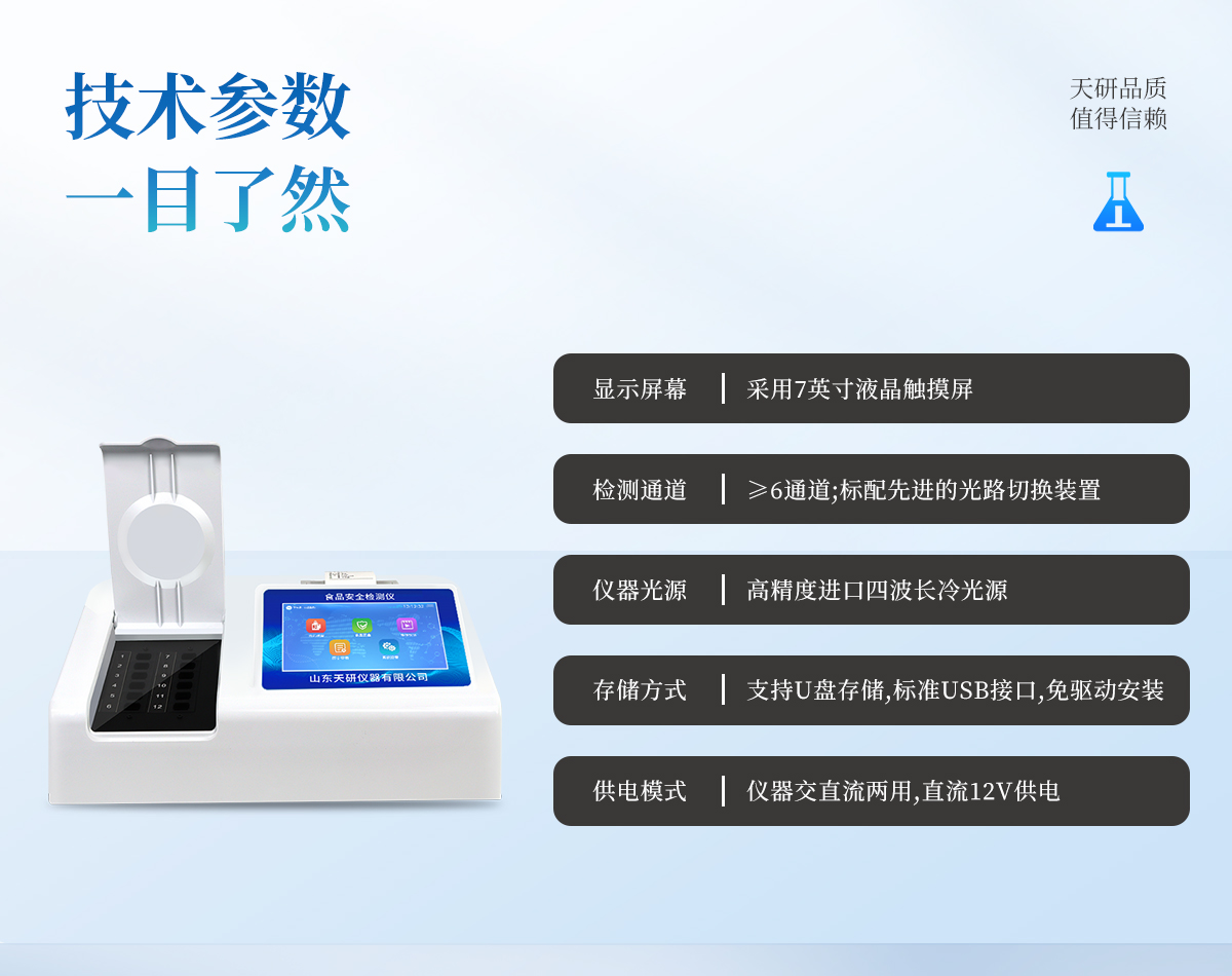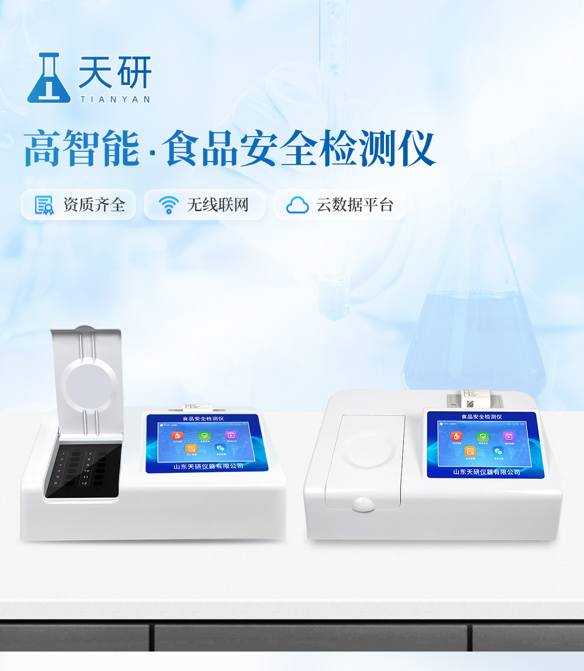 多功能食品安全檢測儀可快速檢測200多項(xiàng)目,包含非食用化學(xué)物質(zhì)、濫用食品添加劑、農(nóng)藥殘留、獸藥殘留、重金屬、病害肉、營養(yǎng)強(qiáng)化劑、抗生素類殘留、激素類殘留、真菌毒素類殘留、化學(xué)類殘留等現(xiàn)場的定性定量檢測。該多功能食品安全檢測儀為集成化食品安全快速檢測分析設(shè)備,廣泛應(yīng)用于市場監(jiān)管局、檢測中心、衛(wèi)生監(jiān)督部門、農(nóng)業(yè)部門、院校及各單位食堂、食品肉產(chǎn)品深加工企業(yè)、商超市場、司法部門、餐飲機(jī)構(gòu)、養(yǎng)殖場、屠宰場、檢驗(yàn)檢疫部門等單位使用。