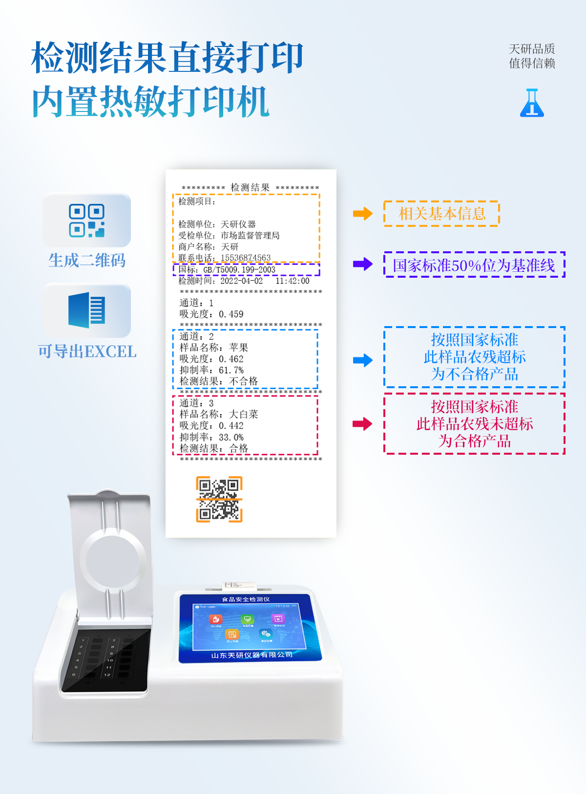 | 安卓智能操作系統(tǒng),采用更加**和人性化操作,儀器具有網(wǎng)線連接、wifi聯(lián)網(wǎng)上傳、GPRS無線遠(yuǎn)傳功能,快速上傳數(shù)據(jù)。 | 智能化程度高,儀器具有自檢功能:具有開機(jī)自檢和調(diào)零功能,具有自動(dòng)檢測重復(fù)性功能。 | 檢測通道:≥12個(gè)檢測通道,可以同時(shí)測試多個(gè)樣品,每個(gè)樣品由程序控制分別獨(dú)立工作,不會(huì)互相干擾。 | 顯示方式:≥8英寸液晶觸摸屏顯示,人性化中文操作界面,讀數(shù)直觀、簡單。 | 配備新一代嵌入式熱敏打印機(jī),可選擇手動(dòng)打印或者自動(dòng)打印,檢測完成可自動(dòng)打印檢測報(bào)告和二維碼。 | 光源采用進(jìn)口超高亮發(fā)光二極管,高精度、穩(wěn)定性強(qiáng)、光源可控、可以關(guān)掉不使用的光源,功耗更低。 | 采用USB2.0接口設(shè)計(jì),方便數(shù)據(jù)的存貯和移動(dòng),并可隨時(shí)與計(jì)算機(jī)直接相連,并且可用計(jì)算機(jī)控制儀器。實(shí)現(xiàn)數(shù)據(jù)查詢、瀏覽、分析、統(tǒng)計(jì)、打印等。 | 儀器帶有監(jiān)管平臺。數(shù)據(jù)可局域網(wǎng)和互聯(lián)網(wǎng)數(shù)據(jù)上傳,檢測結(jié)果直接傳至食品安全監(jiān)管平臺。進(jìn)行區(qū)域食品安全監(jiān)管及大數(shù)據(jù)分析處理,檢測區(qū)域食品安全長短期動(dòng)態(tài),達(dá)到食品安全問題預(yù)估、預(yù)警 | 一體化便攜式快檢設(shè)備,滿足現(xiàn)場及流動(dòng)檢測使用需求,能夠在同一軟件下實(shí)現(xiàn)所有檢測項(xiàng)目的檢測,并可通過同一窗口直觀顯示檢測結(jié)果。 | 儀器具有多品類多種類樣品菜單庫,可靈活選擇檢測樣品,不同的檢測通道可同時(shí)檢測不同的樣品項(xiàng)目。也可在儀器上直接編輯錄入樣品名稱、檢測指標(biāo)、送檢單位等信息并保存進(jìn)樣品數(shù)據(jù)庫。 | 樣品處理簡單省力,整體操作快速、安全、便捷。 | 儀器具有自身保護(hù)功能,可設(shè)置用戶名及密碼,防止非工作人員操作等。 | 高靈敏度,高檢測精度,高重復(fù)性精度,掃描式高精度光學(xué)傳感器。 | 儀器具有重新校準(zhǔn)、鎖定、恢復(fù)出廠設(shè)置功能。 | 支持U盤存儲(chǔ)。 結(jié)果判定線可修改,對照值標(biāo)定值可保存,斷電不丟失數(shù)據(jù)。 |