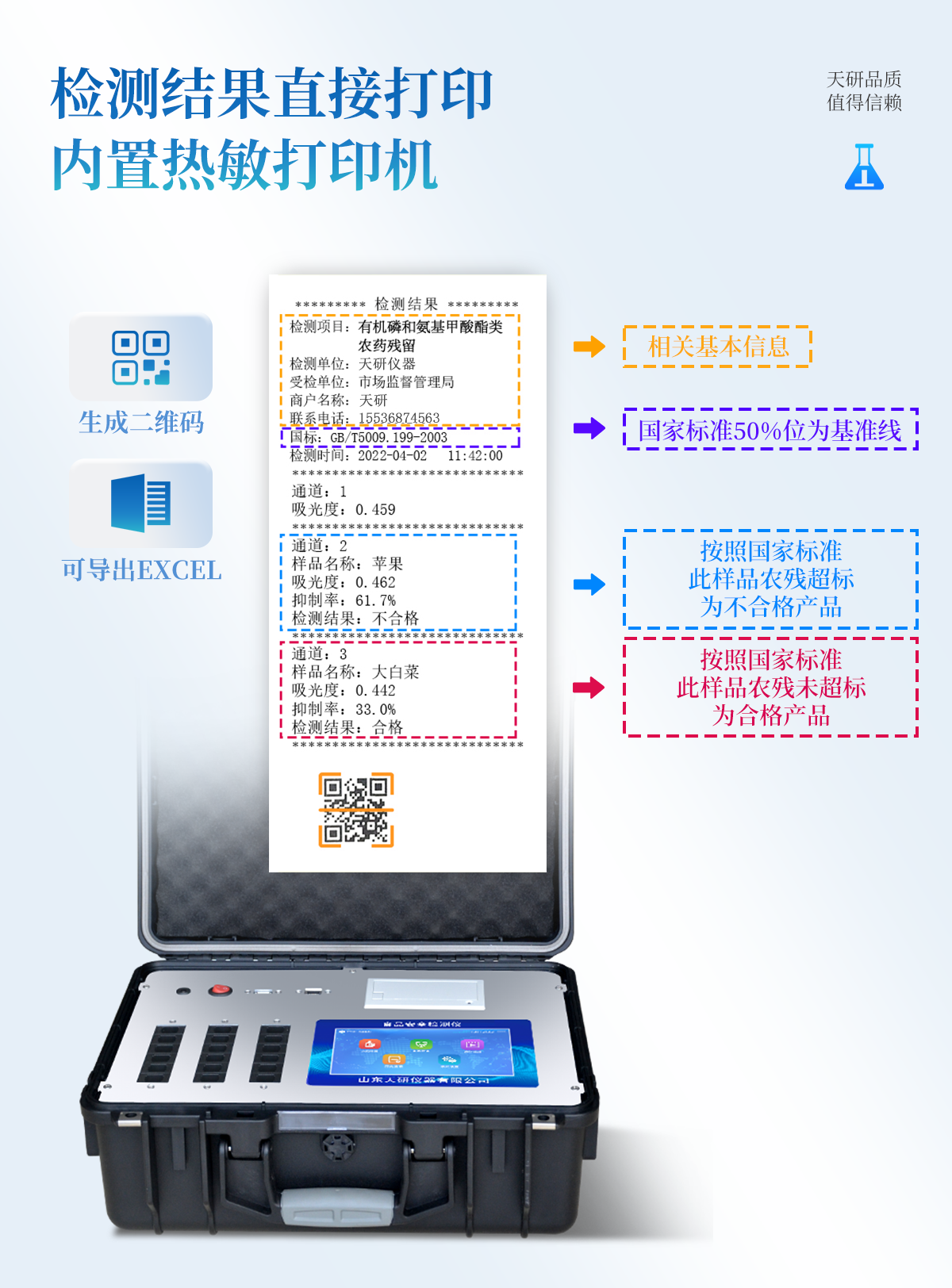 | 安卓智能操作系統(tǒng),采用更加**的UI交互界面,儀器具有wifi聯(lián)網(wǎng)上傳、4G聯(lián)網(wǎng)傳輸、GPRS無線遠(yuǎn)傳、網(wǎng)線連接功能,快速批量上傳數(shù)據(jù)。 | 智能化程度高,儀器具有自檢功能:具有開機(jī)自檢和調(diào)零功能,具有自動(dòng)檢測重復(fù)性功能。 | 新一代高速熱敏打印機(jī),檢測完成可自動(dòng)打印或批量打印檢測報(bào)告和二維碼。 | 儀器帶有監(jiān)管平臺(tái),數(shù)據(jù)可局域網(wǎng)和互聯(lián)網(wǎng)數(shù)據(jù)上傳,檢測結(jié)果直接傳至食品安全監(jiān)管平臺(tái)。進(jìn)行區(qū)域食品安全監(jiān)管及大數(shù)據(jù)分析處理與數(shù)據(jù)統(tǒng)計(jì),檢測區(qū)域食品安全長短期動(dòng)態(tài),達(dá)到食品安全問題預(yù)估、預(yù)警 | 一體化主機(jī),包含食品安全檢測模塊、多通道農(nóng)藥殘留檢測模塊、膠體金免疫層析檢測模塊。 | 一體化便攜式快檢設(shè)備,滿足現(xiàn)場及流動(dòng)檢測使用需求,能夠在同一軟件下實(shí)現(xiàn)所有檢測項(xiàng)目的檢測,并可通過同一窗口直觀顯示檢測結(jié)果。 | 膠體金模塊檢測方式:軌道式自動(dòng)傳輸掃描,檢測完成后自動(dòng)退出檢測卡。 | CT線自動(dòng)識(shí)別,無需手動(dòng)調(diào)整。 | 內(nèi)置強(qiáng)大的數(shù)據(jù)庫,具有多品類多種類樣品菜單功能,可靈活選擇檢測樣品,不同的檢測通道可同時(shí)檢測不同的樣品項(xiàng)目。也可在儀器上直接編輯錄入樣品名稱、檢測指標(biāo)、送檢單位等信息并保存進(jìn)樣品數(shù)據(jù)庫。 | 產(chǎn)品內(nèi)置操作演示視頻,是您身邊的化驗(yàn)指導(dǎo)專家。 | 樣品處理簡單省力,整體操作快速、安全、便捷。 | 儀器具有自身保護(hù)功能,可設(shè)置用戶名及密碼,防止非工作人員操作等。 | 高靈敏度,高檢測精度,高重復(fù)性精度,掃描式高精度光學(xué)傳感器。 | 結(jié)果判定線可修改,對照值標(biāo)定值可保存,斷電不丟失數(shù)據(jù)。 | 兼容市場上所有的膠體金卡,使用耗材不受限制,極大增強(qiáng)用戶使用體驗(yàn)。 | 儀器具有重新校準(zhǔn)、鎖定、恢復(fù)出廠設(shè)置功能。 |