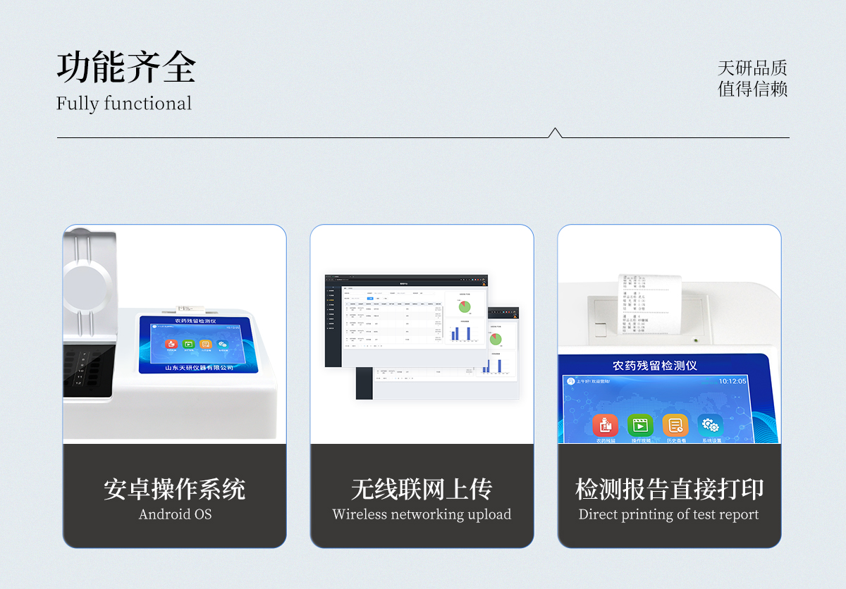 | 乙酰膽堿酯酶和丁酰膽堿酯酶試劑均可以使用,符合國(guó)家標(biāo)準(zhǔn)和農(nóng)業(yè)部標(biāo)準(zhǔn)的要求。 | 自動(dòng)判斷樣品是否合格,檢測(cè)結(jié)果更加直觀。 | 儀器具有100多種蔬菜名稱菜單庫(kù),分類管理,并可按需添加或刪除蔬菜名,編輯蔬菜名稱,可直接打印出蔬菜名稱。 | 檢測(cè)通道:10個(gè)檢測(cè)通道,可以同時(shí)測(cè)試多個(gè)樣品,循環(huán)檢測(cè),即放即檢,每個(gè)樣品由程序控制分別獨(dú)立工作,不會(huì)互相干擾。 | 智能操作系統(tǒng),采用更加人性化操作,主控采用多核處理器,主頻1.88Ghz,運(yùn)轉(zhuǎn)速度更快速,穩(wěn)定性更強(qiáng)。 | 顯示方式:7英寸高靈敏真彩觸摸屏顯示,人性化中文操作界面,讀數(shù)直觀、簡(jiǎn)單。 | 打印機(jī)采用串口5v打印,可選擇手動(dòng)打印或者自動(dòng)打印,三分鐘出打印結(jié)果,打印格式為檢測(cè)人姓名、吸光度差值、檢測(cè)時(shí)間、檢測(cè)機(jī)構(gòu)、樣品名稱及結(jié)果判定。 | 光源采用進(jìn)口超高亮發(fā)光二極管,具有低功耗、高精度、穩(wěn)定性強(qiáng)、光源可控可以關(guān)掉不使用的光源,響應(yīng)速度快等優(yōu)點(diǎn)。 | 智能恒流穩(wěn)壓,光強(qiáng)自動(dòng)校準(zhǔn),長(zhǎng)時(shí)間連續(xù)工作光源無(wú)溫漂現(xiàn)象。 | 儀器具有GPRS遠(yuǎn)傳功能,可插手機(jī)卡實(shí)現(xiàn)數(shù)據(jù)遠(yuǎn)傳平臺(tái),wifi聯(lián)網(wǎng)功能,可將數(shù)據(jù)快速上傳電腦,進(jìn)行數(shù)據(jù)管理與統(tǒng)計(jì)。 | 采用USB2.0接口設(shè)計(jì),方便數(shù)據(jù)的存貯和移動(dòng),并可隨時(shí)與計(jì)算機(jī)直接相連,并且可用計(jì)算機(jī)控制儀器。實(shí)現(xiàn)數(shù)據(jù)查詢、瀏覽、分析、統(tǒng)計(jì)、打印等。 | 智能化程度高,儀器具有自檢功能:具有開機(jī)自檢和調(diào)零功能,具有自動(dòng)檢測(cè)重復(fù)性功能 | 儀器具有自身保護(hù)功能,可設(shè)置用戶名及密碼,防止非工作人員操作等。 | 采用DC12v直流供電,安全系統(tǒng)更高,并且配備6A鋰電池充電器。 | 儀器具有重新校準(zhǔn)、鎖定、恢復(fù)出廠設(shè)置功能。 |