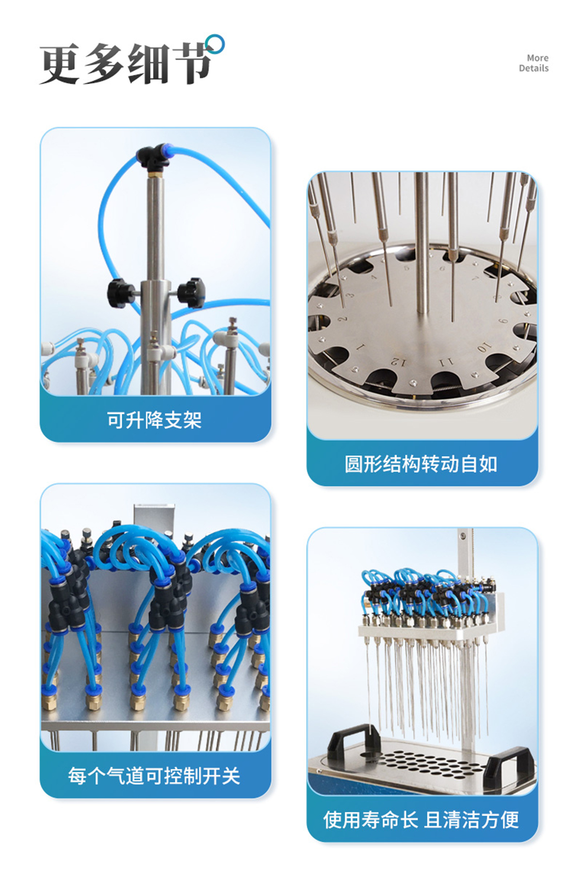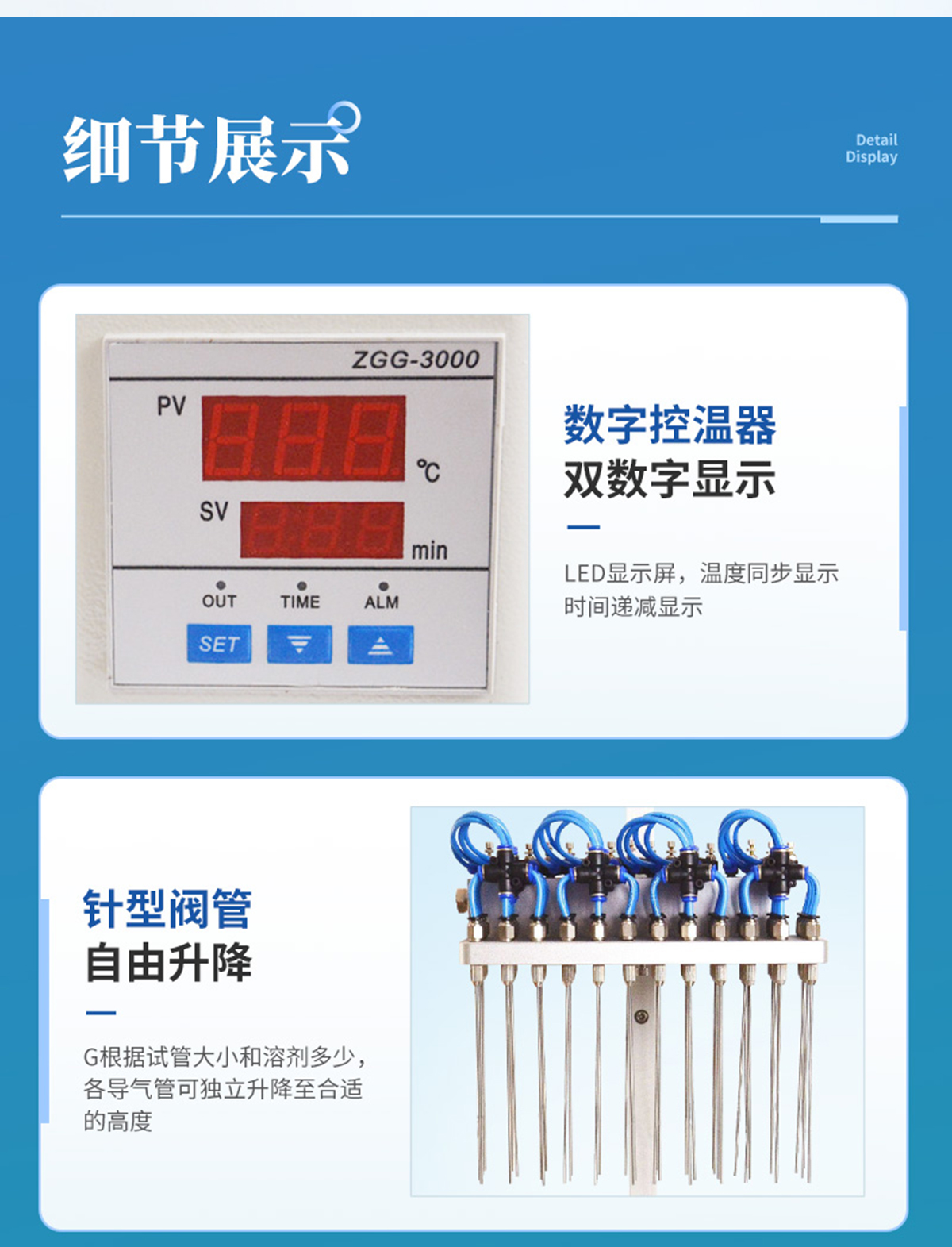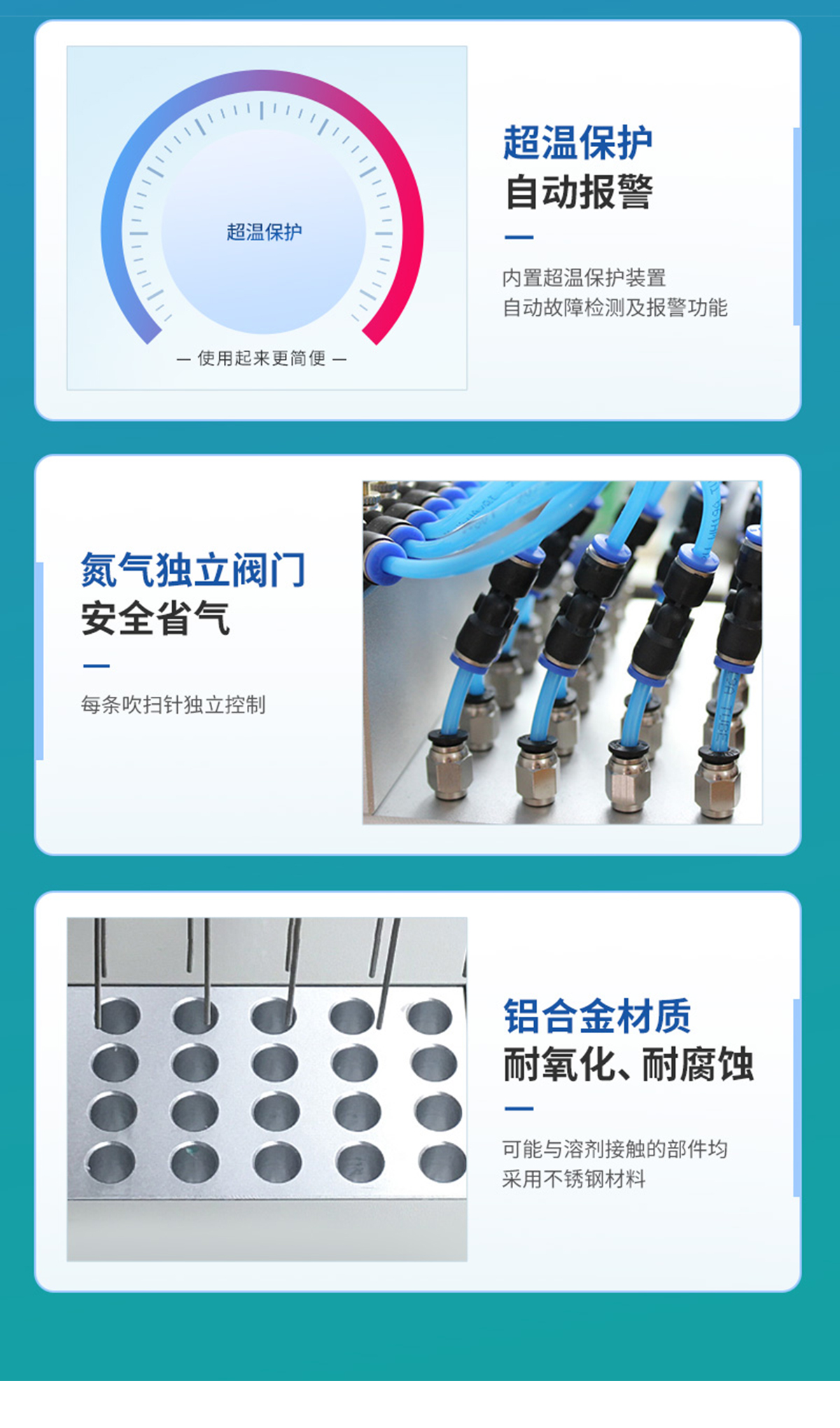 | 每個(gè)吹針都可以獨(dú)立控制,避免引起交叉污染。 | 儀器氣腔高度可以自行調(diào)節(jié),配備標(biāo)準(zhǔn)氣針長度為15厘米。 | 氮吹儀有36個(gè)氣道控制開關(guān),節(jié)約氣體,每根吹氣針的位置可獨(dú)立改變吹掃位置,使之適用不同的樣品容器及不同的樣品位置 | 在濃縮有毒溶劑時(shí),整個(gè)系統(tǒng)可置于通風(fēng)柜中,降低危險(xiǎn)。 | 內(nèi)置超溫保護(hù)裝置,自動故障檢測及報(bào)警功能,方便實(shí)用。 | 儀器有LED顯示屏,溫度同步顯示、時(shí)間遞減顯示,可時(shí)時(shí)觀察溫度變化。 | 具有整體溫度更均勻,加熱速度快 | 本產(chǎn)品還可以作為普通的干式恒溫器使用 | 使用起來更簡便,而且溫度也可以達(dá)到150℃,可以更好濃縮樣品 |