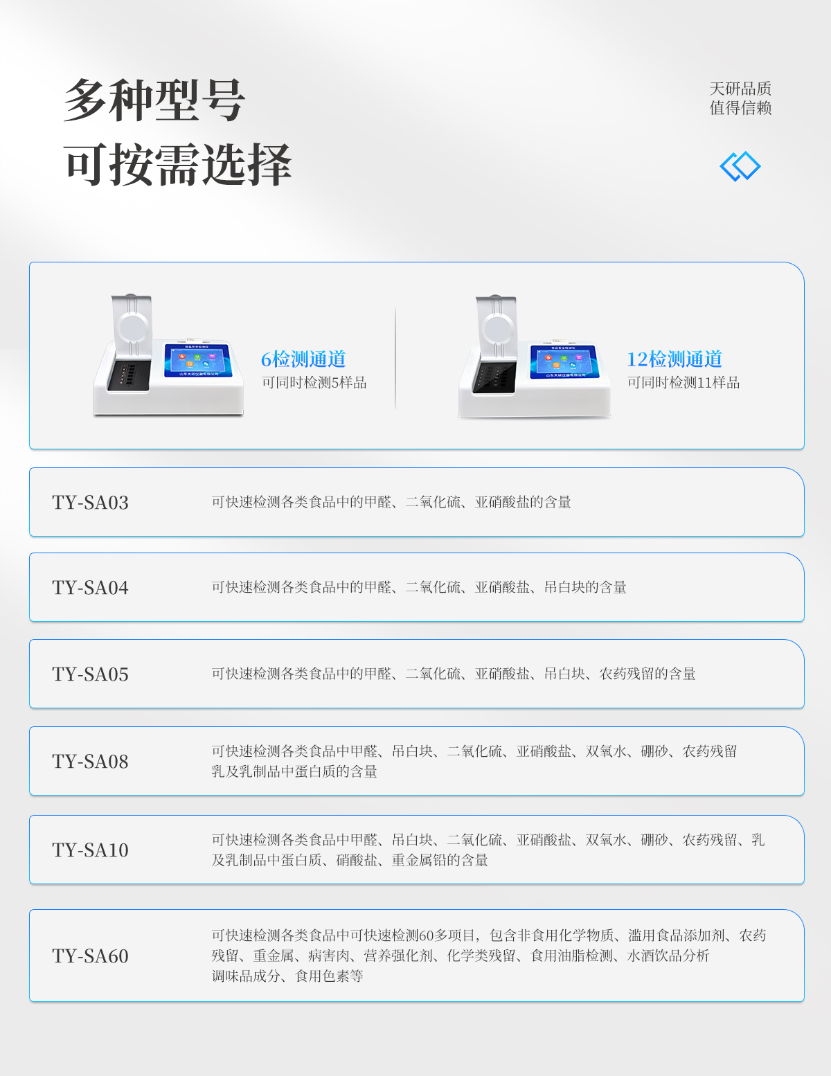 | 儀器采用臺式一體化系統(tǒng)檢測技術(shù),將分光光度模塊、新型農(nóng)殘檢測模塊、數(shù)字化管理模塊、無線通訊模塊高度集成于一體,支持檢測200種食品安全檢測項(xiàng)目,同時(shí)預(yù)留升級檢測方法。 | 儀器檢測模塊標(biāo)準(zhǔn)化、智能化,可隨意自由組合。檢測箱體內(nèi)置多個(gè)標(biāo)準(zhǔn)檢測單元,檢測模塊可以調(diào)整配置。 | 儀器采用全新安卓智能系統(tǒng),主控芯片采用 ARM Cortex-A7,RK3288/4核處理器,10.1寸高清液晶觸摸豎屏,更加**的UI交互界面,運(yùn)轉(zhuǎn)快捷;儀器配備無線通信模塊: 4G(APN)通訊模塊、Wifi模塊,藍(lán)牙傳輸,同時(shí)具有雙USB接口以及RJ45接口能以多種方式實(shí)現(xiàn)數(shù)據(jù)保存和數(shù)據(jù)傳輸功能。 | 創(chuàng)新檢測模式: | ★檢測通道:≥12通道;采用精密旋轉(zhuǎn)比色池設(shè)計(jì),使用同芯片同光源校準(zhǔn)精度,解決不同光源之間的誤差值。1-12通道間誤差0.1%。(**號:ZL202022821055.2) | ★儀器具有自動識別比色皿檢測功能,即:將樣品比色皿放入儀器后,點(diǎn)擊樣品檢測,儀器自動識別比色皿進(jìn)行通道檢測。 | 進(jìn)口高精光源: | 高精度進(jìn)口四波長冷光源,通道配置 410、520、590、630nm 波長光源,一個(gè)光源芯片驅(qū)動一個(gè)光源,誤差極小,每臺設(shè)備單獨(dú)**校準(zhǔn)光源,**比對,同時(shí)參照四種不同波段光源全方位覆蓋市面上99%的農(nóng)殘食品項(xiàng)目檢測。 | 智能化操作系統(tǒng): | 便捷操作系統(tǒng):設(shè)備檢測時(shí)可在同一檢測界面自動對應(yīng)相關(guān)檢測通道一次性選擇1-12個(gè)樣品名稱,無須退出界面,節(jié)省操作時(shí)間。 | 數(shù)據(jù)集成系統(tǒng):設(shè)備首頁自動統(tǒng)計(jì)檢測數(shù)據(jù)包含:周檢測數(shù)據(jù)、月檢測數(shù)據(jù),全部檢測總數(shù)量,均包含檢測總數(shù),合格數(shù),不合格數(shù),以及相關(guān)柱形分析圖,對各項(xiàng)檢測數(shù)據(jù)清晰掌握,無需電腦查詢,更加快捷直觀。 | 項(xiàng)目預(yù)設(shè)系統(tǒng):支持添加單個(gè)及多個(gè)相同或不相同的任務(wù)預(yù)設(shè),一鍵快速調(diào)取,每一個(gè)任務(wù)分別可以設(shè)置不同的樣品、批次、編號、來源、備注、抽樣信息、檢測信息、受檢信息、復(fù)核信息等更多信息。無縫鏈接平臺和APP實(shí)時(shí)查看下發(fā)任務(wù)。 | 數(shù)據(jù)監(jiān)管系統(tǒng):同步對接監(jiān)管平臺,數(shù)據(jù)可局域網(wǎng)和互聯(lián)網(wǎng)數(shù)據(jù)上傳,檢測結(jié)果可選擇直接傳至食品安全監(jiān)管平臺。集成OSS輸出存儲服務(wù)、區(qū)分設(shè)備定向管理應(yīng)用,進(jìn)行區(qū)域食品安全監(jiān)管及大數(shù)據(jù)分析處理與數(shù)據(jù)統(tǒng)計(jì),檢測區(qū)域食品安全長短期動態(tài),達(dá)到食品安全問題預(yù)估、預(yù)警。 | 自定義打印系統(tǒng):內(nèi)置全新打印系統(tǒng),新創(chuàng)自定義打印方式,可按需靈活設(shè)置開啟或關(guān)閉:產(chǎn)品合格證(國家農(nóng)業(yè)部標(biāo)準(zhǔn)要求),二維碼,抽樣信息、檢測信息,受檢信息、復(fù)核信息、抽樣日期、檢測日期等信息的打印。 | 系統(tǒng)遠(yuǎn)程更新功能:可定向分客戶分儀器更新系統(tǒng),按照不同客戶后期實(shí)際需求添加項(xiàng)目,無需機(jī)器返廠,即可遠(yuǎn)程實(shí)時(shí)升級全新系統(tǒng),節(jié)省時(shí)間成本及避免運(yùn)輸造成設(shè)備損壞。 | 儀器主機(jī)采用一體化防水、抗壓、防撞擊、防腐蝕箱體設(shè)計(jì),同時(shí)配備交直流供電,可連接車載電源,可選配大容量充電鋰電池,滿足現(xiàn)場野外檢測需求。 | 安全證書,放心保障:儀器具有中國計(jì)量科學(xué)研究院校準(zhǔn)證書,**認(rèn)證。 |