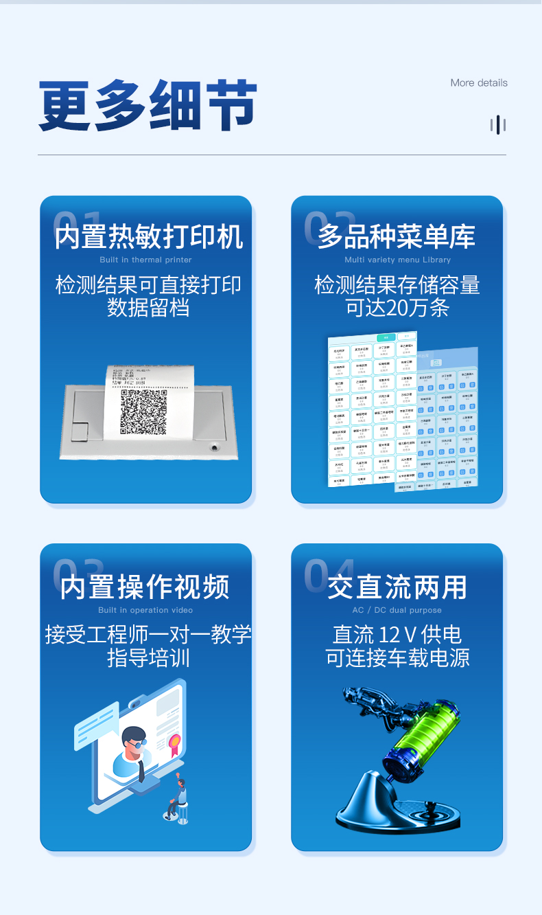 | 儀器采用10.1英寸液晶觸摸屏顯,搭配運(yùn)行安卓智能操作系統(tǒng),主控芯片采用ARM Cortex-A7,RK3288/4核處理器,主頻1.88Ghz,運(yùn)轉(zhuǎn)速度更快速,性能更強(qiáng)。 | 儀器功能包括:膠體金檢測(cè)模塊、數(shù)字化管理模塊、無(wú)線通訊模塊等,可以滿足同一軟件下實(shí)現(xiàn)所有檢測(cè)項(xiàng)目的檢測(cè),并在同一窗口展示檢測(cè)結(jié)果。 | 一體化便攜式快檢設(shè)備,采用交直流兩用供電方式,可連接車(chē)載電源,配備6ah大容量充電鋰電池,可以滿足現(xiàn)場(chǎng)及流動(dòng)檢測(cè)使用的需求。儀器尺寸:43×35×20cm, 主機(jī)凈重:5.1kg | 系統(tǒng)自帶數(shù)據(jù)集成模塊,設(shè)備首頁(yè)自動(dòng)統(tǒng)計(jì)檢測(cè)數(shù)據(jù)包含:周檢測(cè)數(shù)據(jù)、月檢測(cè)數(shù)據(jù),全部檢測(cè)總數(shù)量,均包含檢測(cè)總數(shù),合格數(shù),不合格數(shù),以及相關(guān)柱形分析圖,對(duì)各項(xiàng)檢測(cè)數(shù)據(jù)清晰掌握,無(wú)需電腦查詢,更加快捷直觀。 | 儀器具有任務(wù)預(yù)設(shè)模塊,可在樣品送檢前提前預(yù)設(shè)樣品名稱、檢測(cè)指標(biāo)、送檢單位等信息,樣品送檢時(shí)一鍵調(diào)取保存信息,檢測(cè)更加方便快捷。 | 膠體金檢測(cè)模塊:軌道式自動(dòng)傳輸掃描方式,可實(shí)時(shí)顯示金標(biāo)卡實(shí)時(shí)圖像,系統(tǒng)自動(dòng)分析并呈現(xiàn)出CT曲線圖,CT線自動(dòng)識(shí)別,無(wú)需手動(dòng)調(diào)整,完成檢測(cè)后自動(dòng)退出檢測(cè)卡。 結(jié)果判定線可修改,對(duì)照值標(biāo)定值可保存,斷電不丟失數(shù)據(jù)。 兼容市場(chǎng)上其他膠體金卡,使用耗材不受限制,極大增強(qiáng)用戶使用體驗(yàn)。 | 儀器檢測(cè)系統(tǒng)擁有龐大數(shù)據(jù)庫(kù),并且構(gòu)建了完善的檢索、修訂功能。食品庫(kù)涵蓋多種樣品名稱,可按需添加或刪除、編輯樣品名稱;產(chǎn)品數(shù)據(jù)庫(kù)以及歷史檢測(cè)記錄支持一鍵檢索功能。 | 系統(tǒng)打印自定義化,打印格式多樣化,產(chǎn)品合格證(國(guó)家標(biāo)準(zhǔn)要求),二維碼,抽樣信息、檢測(cè)信息,受檢信息、復(fù)核信息、抽樣日期、檢測(cè)日期等信息結(jié)果,可按需求自行設(shè)置打印內(nèi)容。 | A4紙版本報(bào)告打印功能(可選配):設(shè)備擁有兩種結(jié)果展示方式,可以自動(dòng)生成A4打印模板和小票打印模板兩種樣式,可通過(guò)WiFi及網(wǎng)線等方式鏈接外置打印機(jī)可進(jìn)行打印 | 儀器具有 wifi 聯(lián)網(wǎng)上傳、RJ45網(wǎng)線連接功能,可以快速上傳數(shù)據(jù)。同步對(duì)接監(jiān)管平臺(tái),數(shù)據(jù)可局域網(wǎng)和互聯(lián)網(wǎng)數(shù)據(jù)上傳,檢測(cè)結(jié)果直接傳至食品安全監(jiān)管平臺(tái)。進(jìn)行區(qū)域食品安全監(jiān)管及大數(shù)據(jù)分析處理與數(shù)據(jù)統(tǒng)計(jì),檢測(cè)區(qū)域食品安全長(zhǎng)短期動(dòng)態(tài),達(dá)到食品安全問(wèn)題預(yù)估、預(yù)警。 | 設(shè)備支持U盤(pán)存儲(chǔ),標(biāo)準(zhǔn)USB接口,免驅(qū)動(dòng)安裝。檢測(cè)結(jié)果存儲(chǔ)容量20萬(wàn)條以上,可生成Excel表格,進(jìn)行一鍵拷貝,并具有登錄保護(hù)功能,可設(shè)置用戶名及密碼,規(guī)范不同人員操作權(quán)限,防止非工作人員操作,并且可以進(jìn)行重新校準(zhǔn)、鎖定、恢復(fù)出廠設(shè)置功能。儀器固件可升級(jí),后期檢測(cè)項(xiàng)目可擴(kuò)充。 | 儀器具備遠(yuǎn)程升級(jí)功能,可定向分客戶分儀器更新,開(kāi)機(jī)后自動(dòng)更新,并可持續(xù)性免費(fèi)更新系統(tǒng)版本,無(wú)需像傳統(tǒng)產(chǎn)品返廠更新,節(jié)省時(shí)間及人力成本并避免了物流運(yùn)輸返廠升級(jí)導(dǎo)致設(shè)備損壞的潛在風(fēng)險(xiǎn)。 |