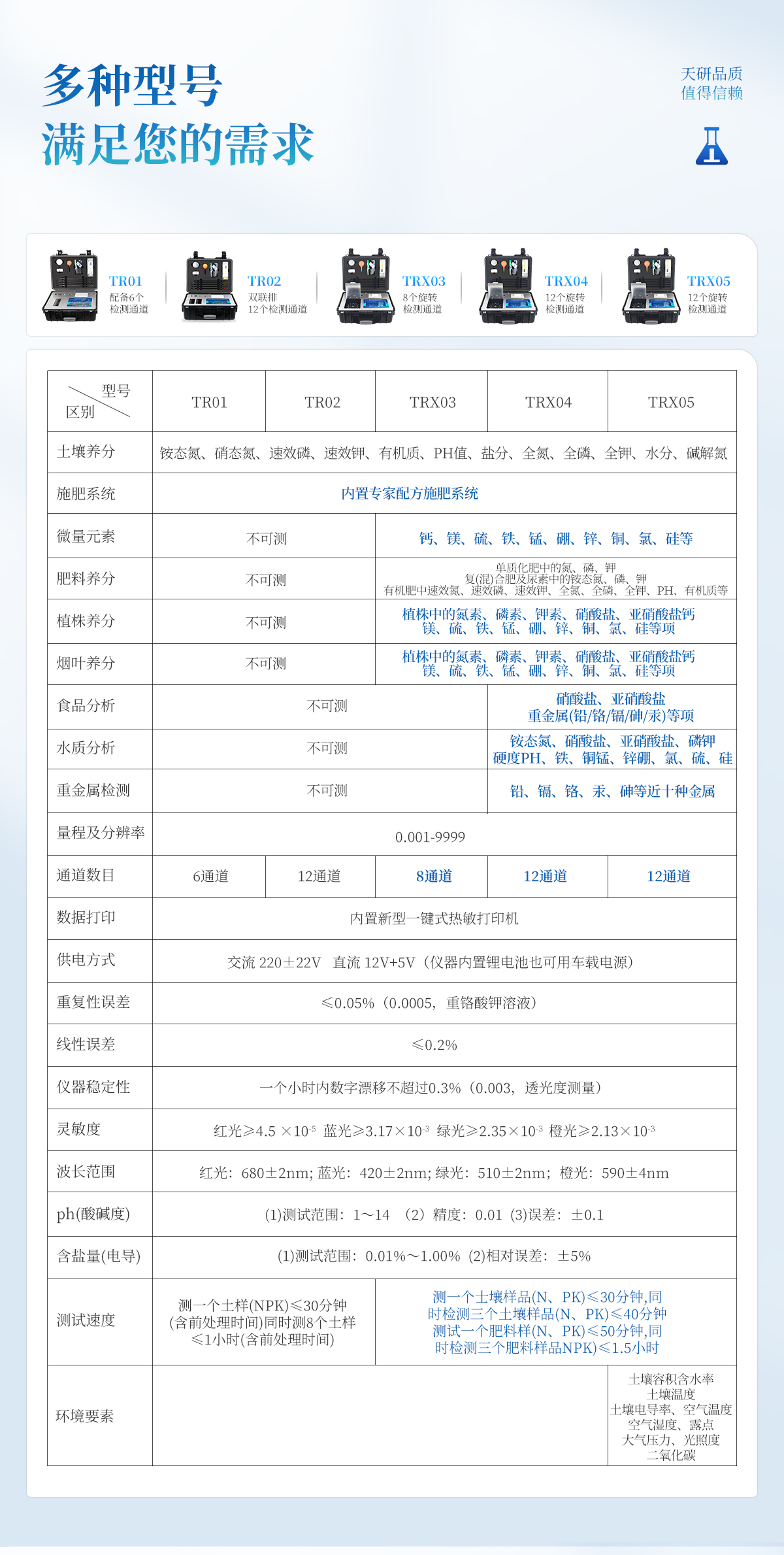 產(chǎn)品簡(jiǎn)介:(新開發(fā),農(nóng)資經(jīng)銷商、農(nóng)技體系普及型)(新一代智能型,內(nèi)置測(cè)土配方施肥功能,圖譜診斷,二維碼打印,數(shù)據(jù)上傳,及測(cè)試用到的所有配件,保證用戶只需提供純凈水即可完成氮磷鉀有機(jī)質(zhì)pH含鹽量的準(zhǔn)確測(cè)定?。┢放疲禾煅? 型號(hào):TY-TR01產(chǎn)品簡(jiǎn)介:配套齊全:該儀器集藥、器、儀為一體,攜帶方便,相當(dāng)于一個(gè)