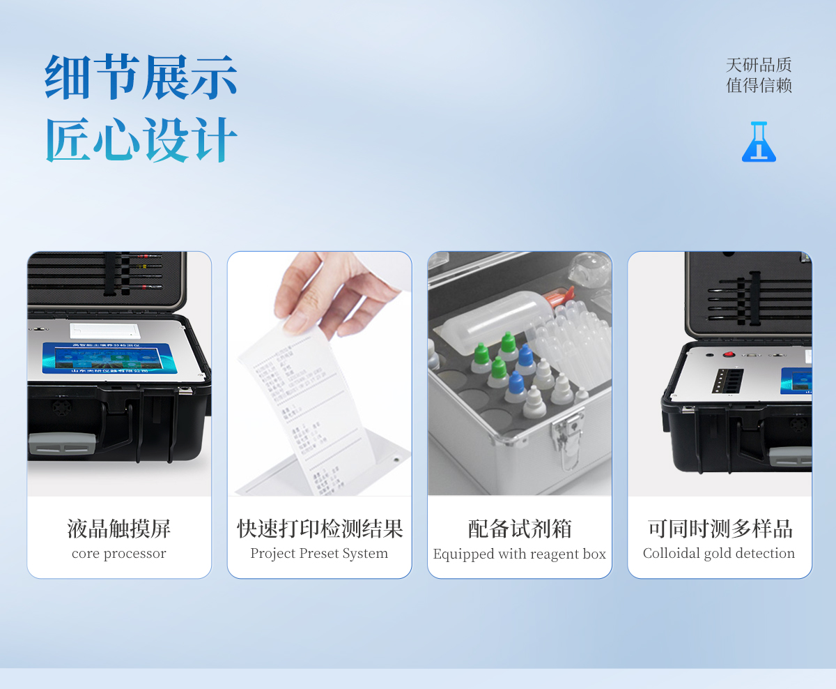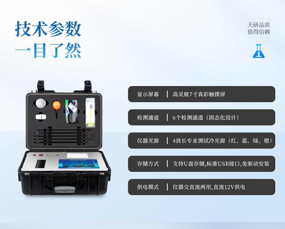 | 配套齊全:該儀器集藥、器、儀為一體,攜帶方便,相當(dāng)于一個(gè)小型移動(dòng)實(shí)驗(yàn)室,無需用戶自配附件,亦可靈活野外流動(dòng)測(cè)試。適于農(nóng)業(yè)服務(wù)部門或農(nóng)資經(jīng)銷商、合作社、肥料廠商、大種植戶測(cè)土施肥。 | 檢測(cè)功能全:測(cè)試項(xiàng)目國(guó)內(nèi)外全面,除標(biāo)配試劑外,其他各類藥劑均可加配選購(gòu)。 | 操作簡(jiǎn)便、速度快捷,配套整套附件及成品藥劑開瓶即用,無須配置。 |