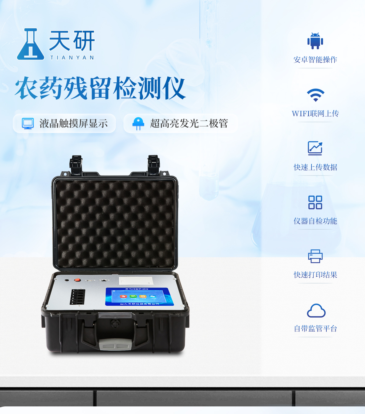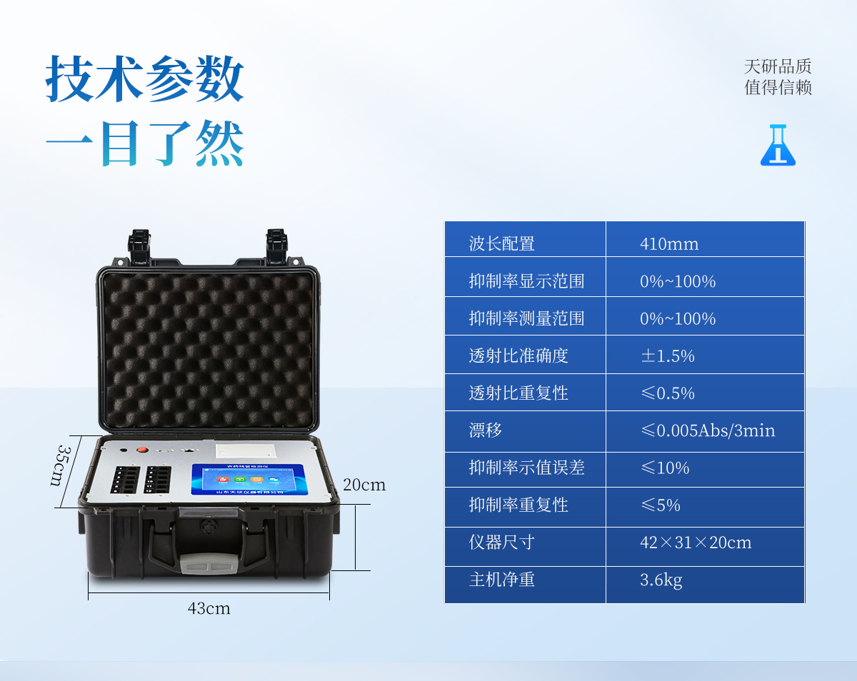 | 隨著人民生活水平的不斷提升,市場對(duì)茶葉的把控愈加嚴(yán)格。針對(duì)現(xiàn)狀,我司專門研發(fā)生產(chǎn)--茶葉專用的農(nóng)藥殘留速測儀;定位茶農(nóng)、茶商、茶葉企業(yè)使用。 此外還可用于果蔬茶生產(chǎn)基地和農(nóng)貿(mào)批發(fā)銷售市場現(xiàn)場檢測,餐館、學(xué)校、食堂、家庭果蔬加工前的安全速測等。 | 檢測通道: 6個(gè)檢測通道,可以同時(shí)測試多個(gè)樣品,每個(gè)樣品由程序控制分別獨(dú)立工作,不會(huì)互相干擾。 | 顯示方式:≥5英寸液晶觸摸屏顯示,人性化中文操作界面,讀數(shù)直觀、簡單。 | 配備嵌入式高速熱敏打印機(jī),可選擇手動(dòng)打印或者自動(dòng)打印,三分鐘出打印結(jié)果。 | 光源采用進(jìn)口超高亮發(fā)光二極管,具有低功耗、穩(wěn)定性強(qiáng)、高靈敏度,高檢測精度,高重復(fù)性精度,光源可控、響應(yīng)速度快等優(yōu)點(diǎn)。 | 采用標(biāo)準(zhǔn)USB接口設(shè)計(jì),免驅(qū)動(dòng)安裝,方便數(shù)據(jù)的存貯和移動(dòng),并可隨時(shí)與計(jì)算機(jī)直接相連,并且可用計(jì)算機(jī)控制儀器。實(shí)現(xiàn)數(shù)據(jù)查詢、瀏覽、分析、統(tǒng)計(jì)、打印等。 | 智能化程度高,儀器具有自檢功能:具有開機(jī)自檢和調(diào)零功能,具有自動(dòng)檢測重復(fù)性功能 | 內(nèi)置強(qiáng)大的數(shù)據(jù)庫,可在儀器上直接選擇樣品名稱、檢測指標(biāo)、送檢單位等信息,也可在儀器上直接編輯錄入樣品名稱、檢測指標(biāo)、送檢單位等信息并保存進(jìn)樣品數(shù)據(jù)庫。 | 支持Wifi網(wǎng)絡(luò),數(shù)據(jù)可局域網(wǎng)和互聯(lián)網(wǎng)數(shù)據(jù)上傳,檢測結(jié)果直接傳至食品安全監(jiān)管平臺(tái)。進(jìn)行區(qū)域食品安全監(jiān)管及大數(shù)據(jù)分析處理,檢測區(qū)域食品安全長短期動(dòng)態(tài),達(dá)到食品安全問題預(yù)估、預(yù)警 |