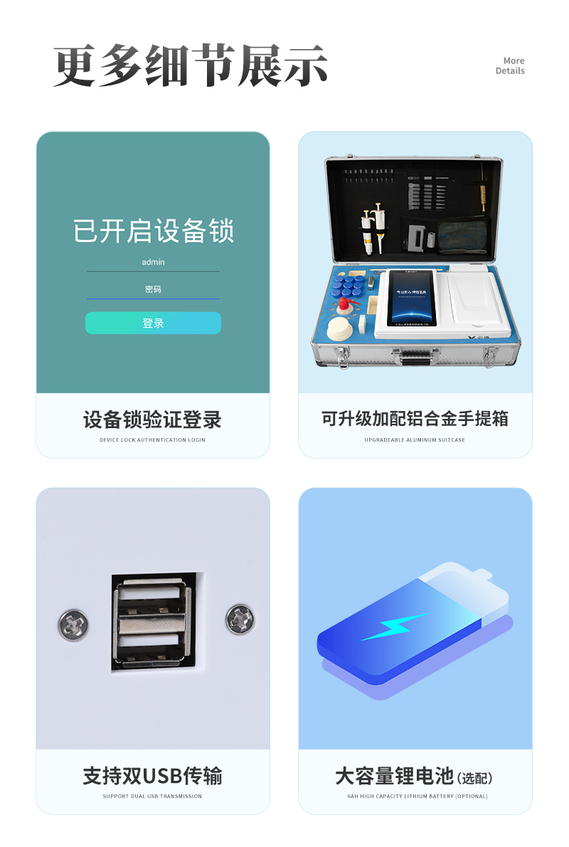 | 儀器采用臺式一體化系統(tǒng)檢測技術(shù),將分光光度模塊、新型農(nóng)殘檢測模塊、數(shù)字化管理模塊、無線通訊模塊高度集成于一體,支持檢測200種食品安全檢測項目,同時預(yù)留升級檢測方法。 | 儀器檢測模塊標(biāo)準(zhǔn)化、智能化,可隨意自由組合。檢測箱體內(nèi)置多個標(biāo)準(zhǔn)檢測單元,檢測模塊可以調(diào)整配置。 | 儀器采用全新安卓智能系統(tǒng),主控芯片采用 ARM Cortex-A7,RK3288/4核處理器,10.1寸高清液晶觸摸豎屏,更加**的UI交互界面,運轉(zhuǎn)快捷;儀器配備無線通信模塊: 4G(APN)通訊模塊、Wifi模塊,藍(lán)牙傳輸,同時具有雙USB接口以及RJ45接口能以多種方式實現(xiàn)數(shù)據(jù)保存和數(shù)據(jù)傳輸功能。 | 創(chuàng)新檢測模式: | ★檢測通道:≥12通道;采用精密旋轉(zhuǎn)比色池設(shè)計,使用同芯片同光源校準(zhǔn)精度,解決不同光源之間的誤差值。1-12通道間誤差0.1%。(**號:ZL202022821055.2) | ★儀器具有自動識別比色皿檢測功能,即:將樣品比色皿放入儀器后,點擊樣品檢測,儀器自動識別比色皿進(jìn)行通道檢測。 | 進(jìn)口高精光源: | 高精度進(jìn)口四波長冷光源,通道配置 410、520、590、630nm 波長光源,一個光源芯片驅(qū)動一個光源,誤差極小,每臺設(shè)備單獨**校準(zhǔn)光源,**比對,同時參照四種不同波段光源全方位覆蓋市面上99%的農(nóng)殘食品項目檢測。 | 智能化操作系統(tǒng): | 便捷操作系統(tǒng):設(shè)備檢測時可在同一檢測界面自動對應(yīng)相關(guān)檢測通道一次性選擇1-12個樣品名稱,無須退出界面,節(jié)省操作時間。 | 數(shù)據(jù)集成系統(tǒng):設(shè)備首頁自動統(tǒng)計檢測數(shù)據(jù)包含:周檢測數(shù)據(jù)、月檢測數(shù)據(jù),全部檢測總數(shù)量,均包含檢測總數(shù),合格數(shù),不合格數(shù),以及相關(guān)柱形分析圖,對各項檢測數(shù)據(jù)清晰掌握,無需電腦查詢,更加快捷直觀。 | 項目預(yù)設(shè)系統(tǒng):支持添加單個及多個相同或不相同的任務(wù)預(yù)設(shè),一鍵快速調(diào)取,每一個任務(wù)分別可以設(shè)置不同的樣品、批次、編號、來源、備注、抽樣信息、檢測信息、受檢信息、復(fù)核信息等更多信息。無縫鏈接平臺和APP實時查看下發(fā)任務(wù)。 | 數(shù)據(jù)監(jiān)管系統(tǒng):同步對接監(jiān)管平臺,數(shù)據(jù)可局域網(wǎng)和互聯(lián)網(wǎng)數(shù)據(jù)上傳,檢測結(jié)果可選擇直接傳至食品安全監(jiān)管平臺。集成OSS輸出存儲服務(wù)、區(qū)分設(shè)備定向管理應(yīng)用,進(jìn)行區(qū)域食品安全監(jiān)管及大數(shù)據(jù)分析處理與數(shù)據(jù)統(tǒng)計,檢測區(qū)域食品安全長短期動態(tài),達(dá)到食品安全問題預(yù)估、預(yù)警。 | 自定義打印系統(tǒng):內(nèi)置全新打印系統(tǒng),新創(chuàng)自定義打印方式,可按需靈活設(shè)置開啟或關(guān)閉:產(chǎn)品合格證(國家農(nóng)業(yè)部標(biāo)準(zhǔn)要求),二維碼,抽樣信息、檢測信息,受檢信息、復(fù)核信息、抽樣日期、檢測日期等信息的打印。 | 系統(tǒng)遠(yuǎn)程更新功能:可定向分客戶分儀器更新系統(tǒng),按照不同客戶后期實際需求添加項目,無需機器返廠,即可遠(yuǎn)程實時升級全新系統(tǒng),節(jié)省時間成本及避免運輸造成設(shè)備損壞。 | 儀器主機采用一體化防水、抗壓、防撞擊、防腐蝕箱體設(shè)計,同時配備交直流供電,可連接車載電源,可選配大容量充電鋰電池,滿足現(xiàn)場野外檢測需求。 | 安全證書,放心保障:儀器具有中國計量科學(xué)研究院校準(zhǔn)證書,**認(rèn)證。 |