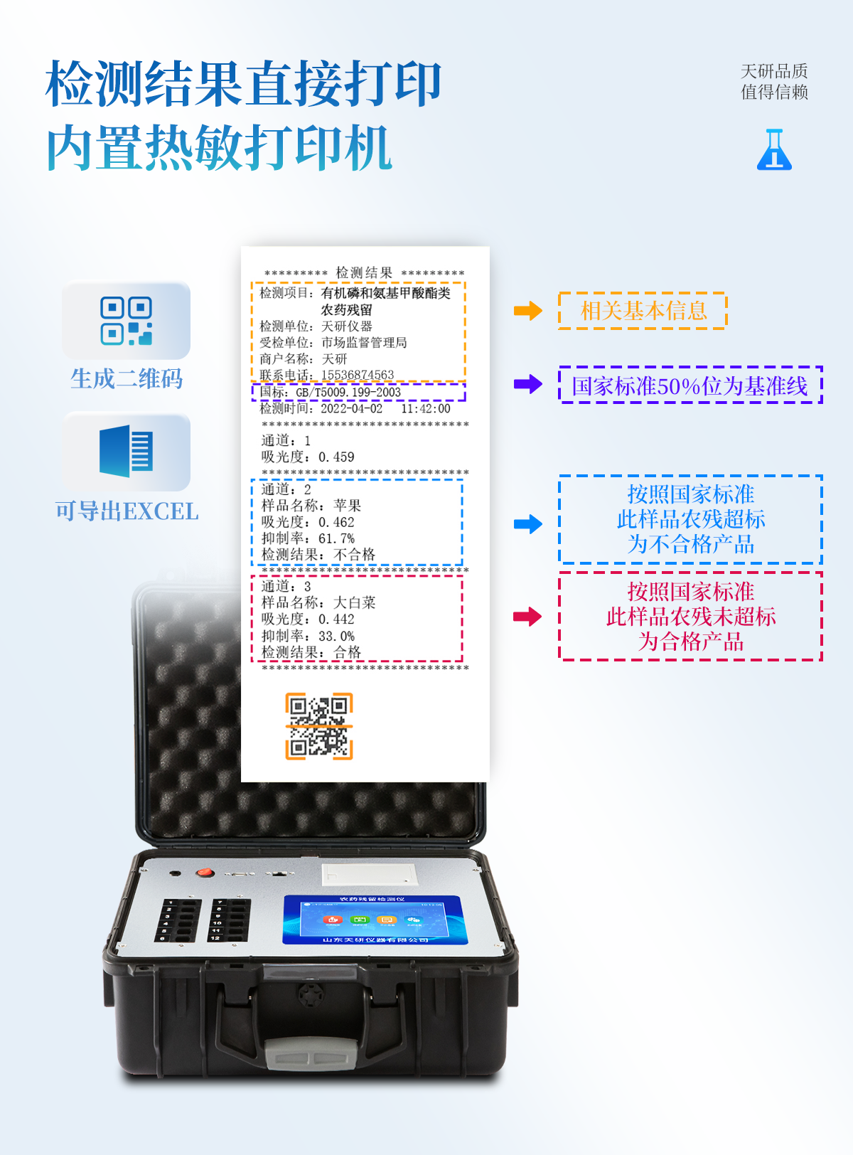 | 隨著人民生活水平的不斷提升,市場對茶葉的把控愈加嚴(yán)格。針對現(xiàn)狀,我司專門研發(fā)生產(chǎn)--茶葉專用的農(nóng)藥殘留速測儀;定位茶農(nóng)、茶商、茶葉企業(yè)使用。 此外還可用于果蔬茶生產(chǎn)基地和農(nóng)貿(mào)批發(fā)銷售市場現(xiàn)場檢測,餐館、學(xué)校、食堂、家庭果蔬加工前的安全速測等。 | 檢測通道: 5個(gè)檢測通道,可以同時(shí)測試多個(gè)樣品,每個(gè)樣品由程序控制分別獨(dú)立工作,不會互相干擾。 | 顯示方式:≥5英寸液晶觸摸屏顯示,人性化中文操作界面,讀數(shù)直觀、簡單。 | 配備嵌入式高速熱敏打印機(jī),可選擇手動(dòng)打印或者自動(dòng)打印,三分鐘出打印結(jié)果。 | 光源采用進(jìn)口超高亮發(fā)光二極管,具有低功耗、穩(wěn)定性強(qiáng)、高靈敏度,高檢測精度,高重復(fù)性精度,光源可控、響應(yīng)速度快等優(yōu)點(diǎn)。 | 采用標(biāo)準(zhǔn)USB接口設(shè)計(jì),免驅(qū)動(dòng)安裝,方便數(shù)據(jù)的存貯和移動(dòng),并可隨時(shí)與計(jì)算機(jī)直接相連,并且可用計(jì)算機(jī)控制儀器。實(shí)現(xiàn)數(shù)據(jù)查詢、瀏覽、分析、統(tǒng)計(jì)、打印等。 | 智能化程度高,儀器具有自檢功能:具有開機(jī)自檢和調(diào)零功能,具有自動(dòng)檢測重復(fù)性功能 | 內(nèi)置強(qiáng)大的數(shù)據(jù)庫,可在儀器上直接選擇樣品名稱、檢測指標(biāo)、送檢單位等信息,也可在儀器上直接編輯錄入樣品名稱、檢測指標(biāo)、送檢單位等信息并保存進(jìn)樣品數(shù)據(jù)庫。 | 支持Wifi網(wǎng)絡(luò),數(shù)據(jù)可局域網(wǎng)和互聯(lián)網(wǎng)數(shù)據(jù)上傳,檢測結(jié)果直接傳至食品安全監(jiān)管平臺。進(jìn)行區(qū)域食品安全監(jiān)管及大數(shù)據(jù)分析處理,檢測區(qū)域食品安全長短期動(dòng)態(tài),達(dá)到食品安全問題預(yù)估、預(yù)警 |