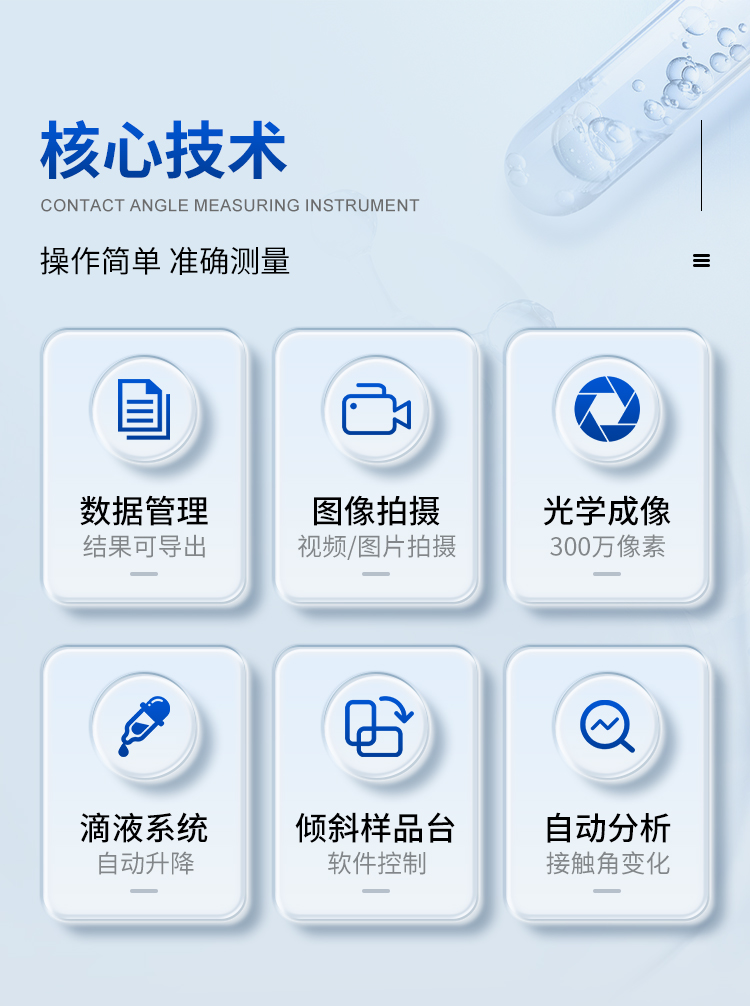 本機(jī)除了利用停滴法測試靜態(tài)接觸角外,更側(cè)重于利用傾斜板法測試和分析動(dòng)態(tài)接觸角(包括前進(jìn)接觸角、后退接觸角和滾動(dòng)角);同時(shí)也可以測試液體表面張力、估算固體表面能和分析潤濕性。廣泛應(yīng)用于生物化工、納米技術(shù)、涂層工藝、耐水材料、科教軍工等尖端領(lǐng)域的測試與研究。