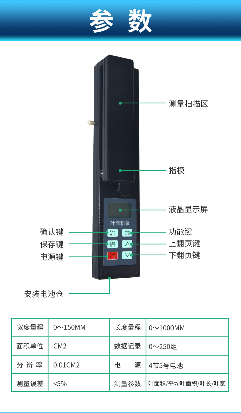 | (1)面積單位:cm2 | (2)分辨率:0.01cm2 | (3)測量誤差:<5% | (4)寬度量程:0~150mm | (5)長度量程:0~1000mm | (6)數(shù)據(jù)記錄:0~250組 | (7)電源:4節(jié)5號電池 |