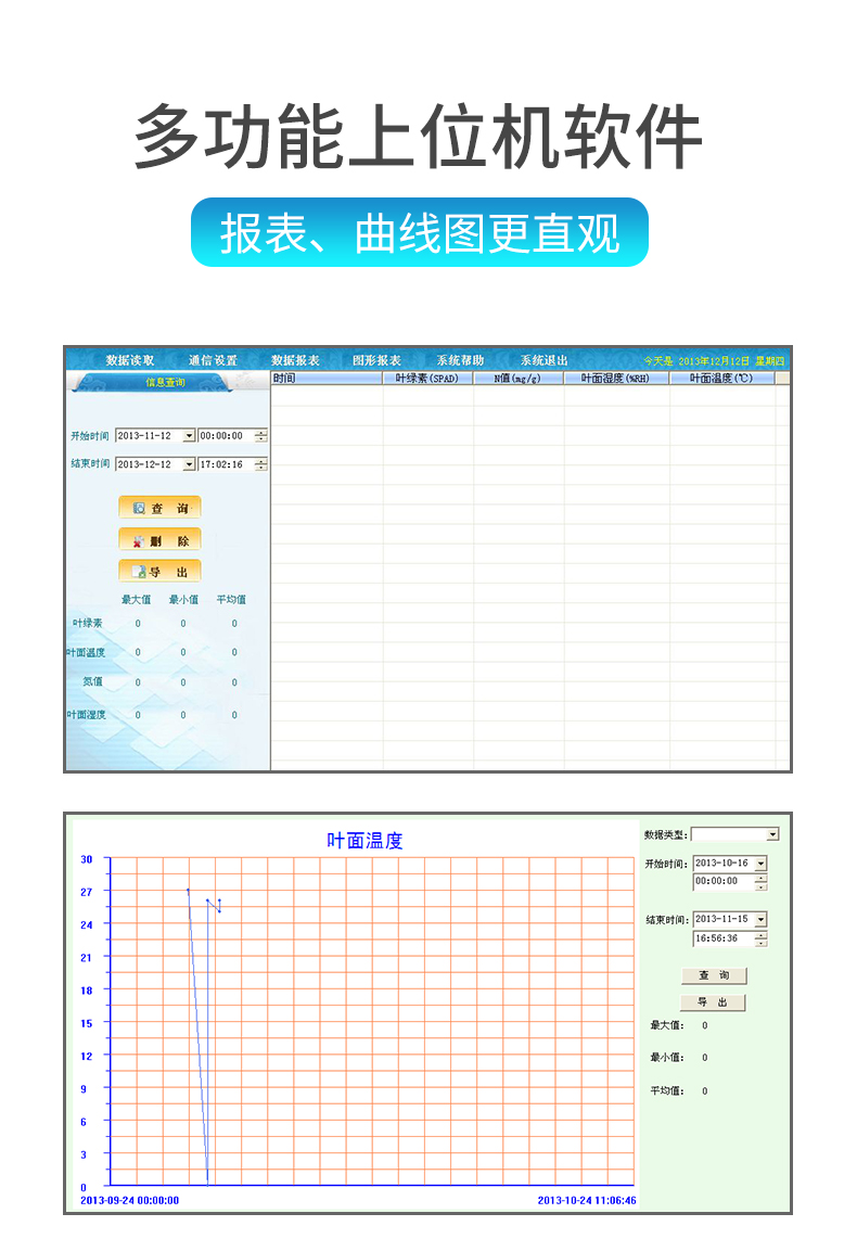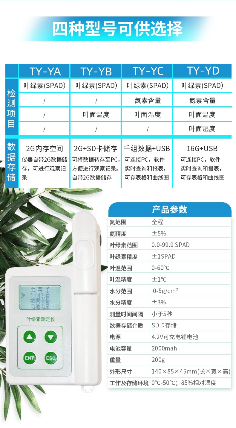 | 葉綠素測定儀TY-YB可同時(shí)測量葉綠素、葉面溫度兩個(gè)參數(shù),帶上位機(jī)軟件功能,數(shù)據(jù)可導(dǎo)出。 | 快速無損植物活體檢測,不影響植物成長。 | 一次操作可同時(shí)測定所有參數(shù),實(shí)時(shí)顯示,且可同時(shí)儲(chǔ)存 | 歷史數(shù)據(jù)查看,即可順序查看,也可跳轉(zhuǎn)查看。 | 測量數(shù)據(jù)可連接計(jì)算機(jī)將測量數(shù)據(jù)導(dǎo)出,便于管理和分析。 | 歷史數(shù)據(jù)查看,即可順序查看,也可跳轉(zhuǎn)查看。 | 意外斷電后已保存在主機(jī)里的數(shù)據(jù)不丟失。 | 對于歷史數(shù)據(jù)即可逐條刪除,也可以一鍵式全部刪除。 | 使用鋰電池供電,帶背光功能。 | 中英文一鍵式切換。 | 上位機(jī)軟件功能(YT-YB型): | 每種參數(shù)的報(bào)表、曲線圖均可選擇時(shí)段查詢查看。 | 顯示每種參數(shù)過程曲線趨勢,**值、*小值、平均值顯示查看,放大、縮小功能。 | 可將存儲(chǔ)記錄的數(shù)據(jù)以EXCEL格式備份保存,方便以后調(diào)用。 | 可將存儲(chǔ)記錄的數(shù)據(jù)曲線圖以BMP圖片格式備份保存,方便以后調(diào)用。 |