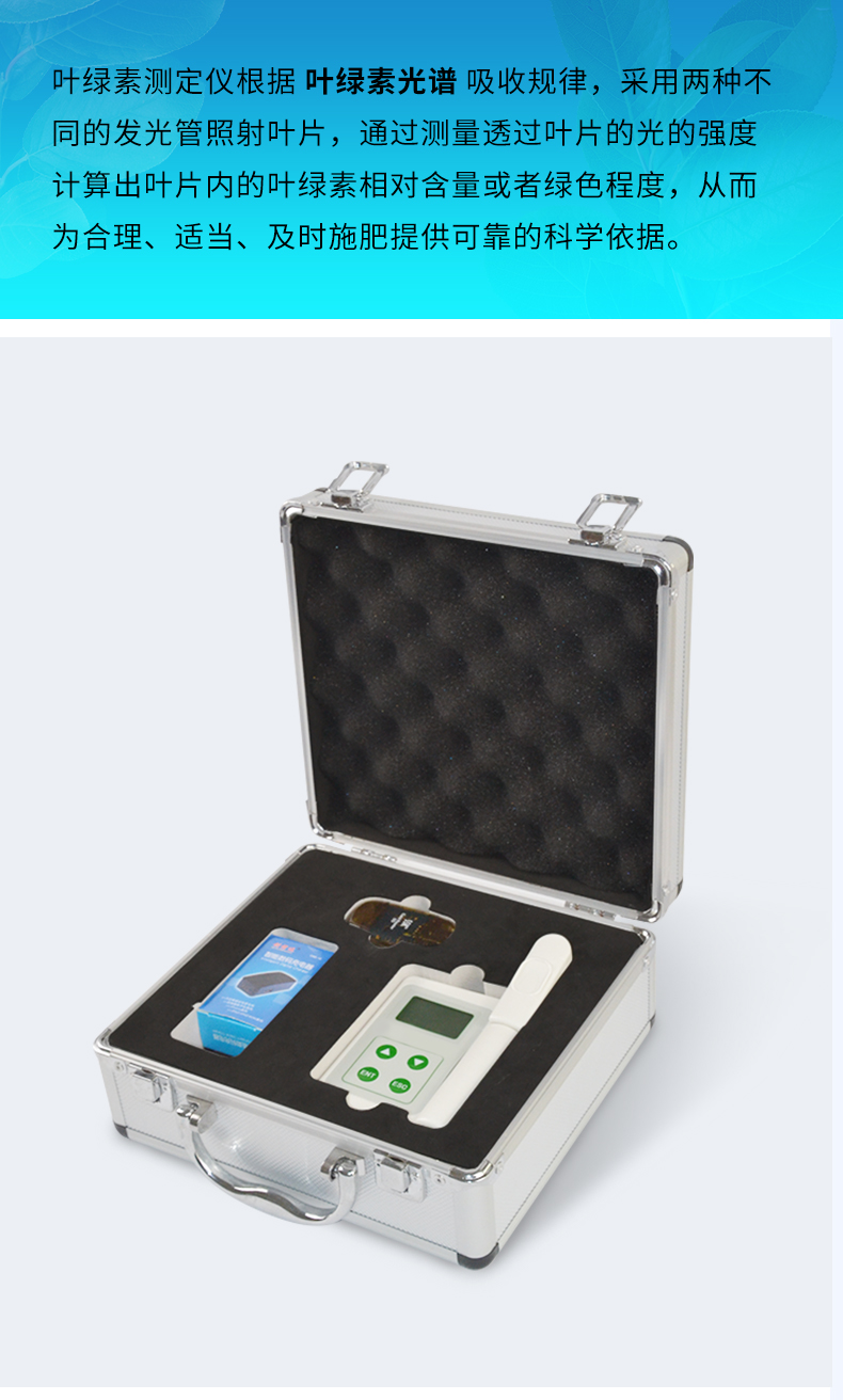 儀器用途:葉綠素測定儀可 以即時(shí)測量植物的葉綠素相對含量(單位SPAD)或綠色程度、葉面溫度,從而解植物真實(shí)的硝基需求量并且了解土壤硝基的缺乏程度或是否過多地施加了氮肥。 可以通過此款儀器來增加氮肥的利用率,并可保護(hù)環(huán)境??蓮V泛應(yīng)用于農(nóng)林相關(guān)科研單位和高校對植物生理指標(biāo)的研究和農(nóng)業(yè)生產(chǎn)的指導(dǎo)。工作原理:根據(jù)