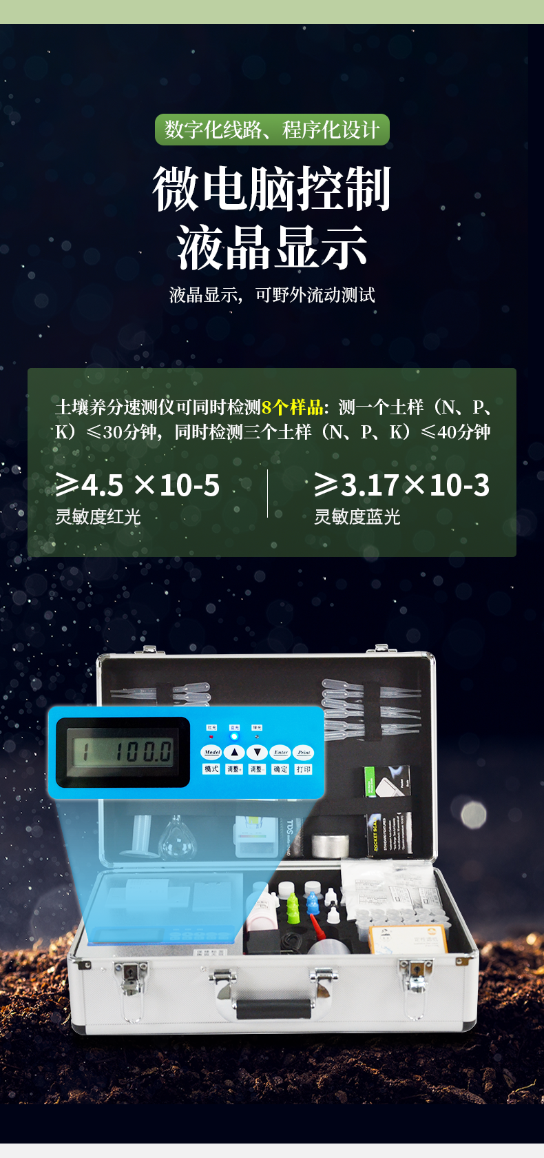 | 配套齊全:土壤養(yǎng)分速測儀該儀器集藥、器、儀為一體,攜帶方便,相當(dāng)于一個小型實驗室。適于農(nóng)業(yè)服務(wù)部門或農(nóng)資經(jīng)銷商、肥料廠商測土施肥和鑒別肥料真假。 | 操作簡便、速度快捷,成品藥劑開瓶即用,無須配置。 | 性能可靠:工作穩(wěn)定性優(yōu)于國家標(biāo)準(zhǔn)JJG179-90指標(biāo)的6倍,重復(fù)性達到光柵型分光光度計指標(biāo)水平。 |