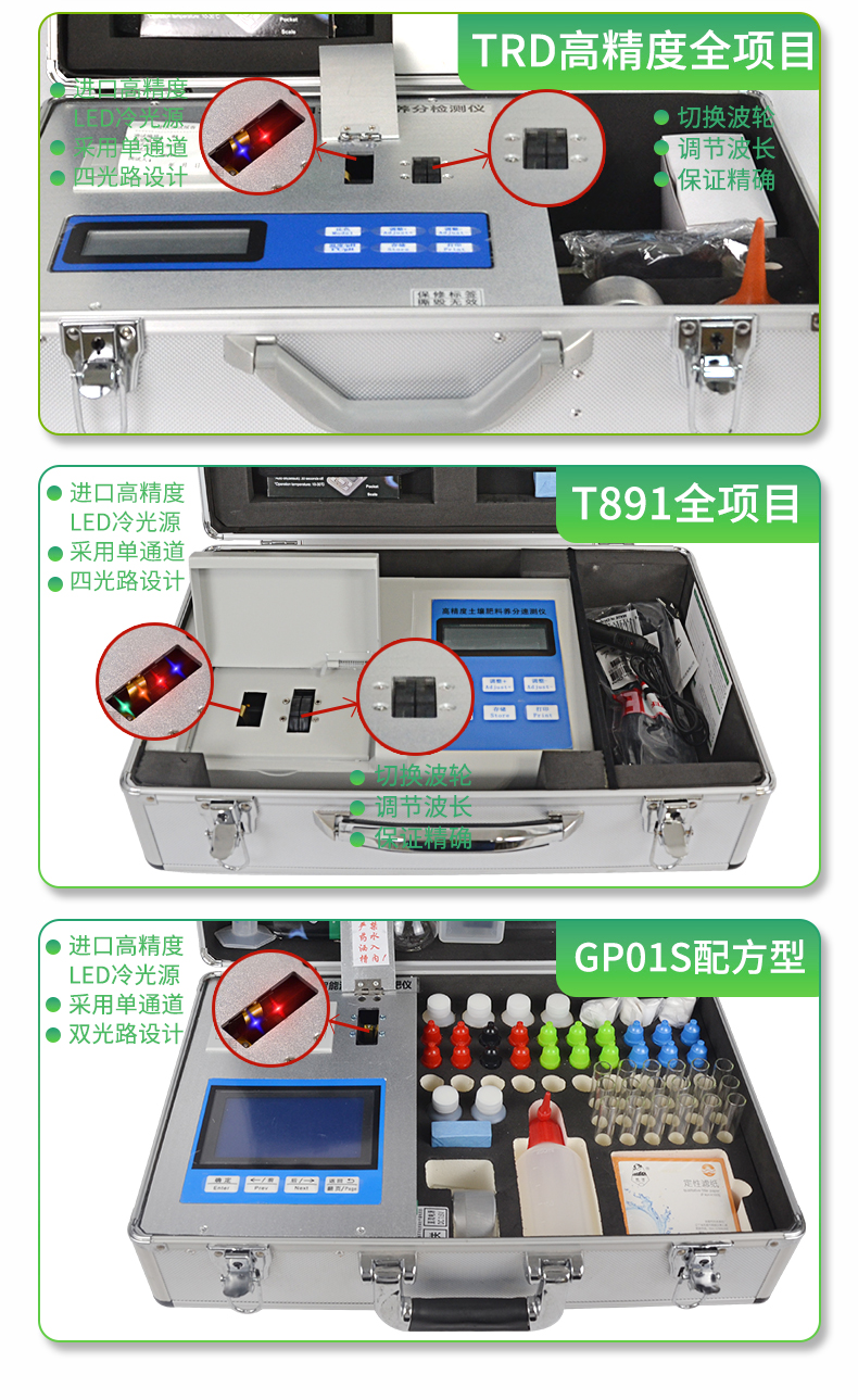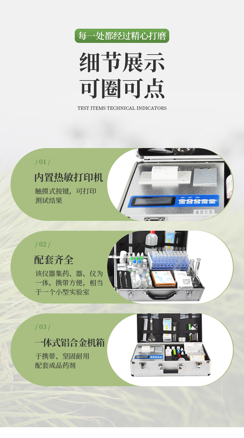 | 1、《機箱/藥劑一體式鋁合金機箱》設(shè)計,便于攜帶、堅固耐用,配套成品藥劑。 | 2、微電腦控制,數(shù)字化線路、程序化設(shè)計,液晶顯示,交直流兩用,可野外流動測試,大程度降低操作者的失誤和勞動強度。 | 3、分辨率:0.001,觸摸式按鍵,內(nèi)置熱敏打印機,可打印測試結(jié)果。 | 4、可檢測土壤及化肥、有機肥、植株中的速效氮、有效磷、速效鉀、全氮、全磷、全鉀、有機質(zhì)含量,土壤酸堿度,含鹽量(擴展)。 | 5、土壤養(yǎng)分速測儀采用高亮度 LED 燈作為光源, 硅半導(dǎo)體作為信號接收系統(tǒng), 壽命長達10萬小時級別。光源穩(wěn)定,一致性好。 | 6、比色槽部分采用單通道、雙光路設(shè)計,無機械位移及磨損,光路測試定位**,保證測定結(jié)果精度。 |
