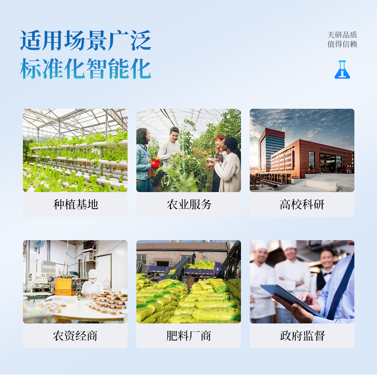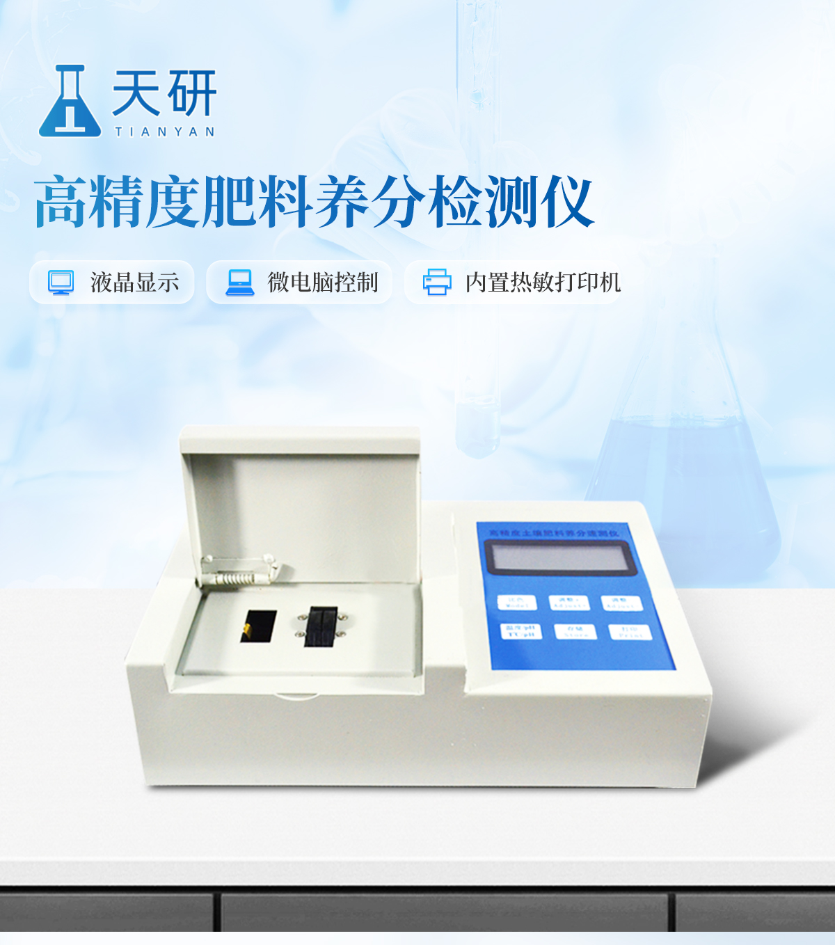 | 測試一個復合肥料樣(N、P、K)≤50分鐘; 每增加一個肥料樣品時間增加20分鐘。 | 測試一個有機肥料樣(N、P、K、有機質) ≤1.5小時;每增加一個樣品加時30分鐘。 |