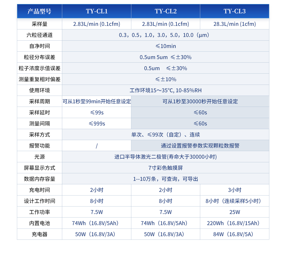 | 采樣量:2.83L/min (0.1cfm) | 六粒徑通道:0.3,0.5,1.0,3.0,5.0,10.0(μm) | 自凈時間:≤10min | 粒徑分布誤差:0.5um 5um ≤±30% | 粒子濃度示值誤差:0.5um ≤±30% | 測量重復(fù)相對偏差:≤±10% | 使用環(huán)境:工作環(huán)境15~35℃, 10-85%RH | 采樣周期:可從1秒至99min開始任意設(shè)定 | 采樣延時:≤99s | 測量間隔:≤999s | 采樣方式:單次、≤99次(自定)、連續(xù) | 光源:進口半導(dǎo)體激光二極管(壽命大于30000小時) | 屏幕顯示方式:7寸彩色觸摸屏 | 數(shù)據(jù)內(nèi)存容量:1--10萬條,可查詢,可導(dǎo)出。 | 充電時間:2小時 | 設(shè)計工作時間:8小時 | 平均功率:7.5W | 內(nèi)置電池:74Wh(16.8V/5Ah) | 充電器:50W(16.8V/3A) |