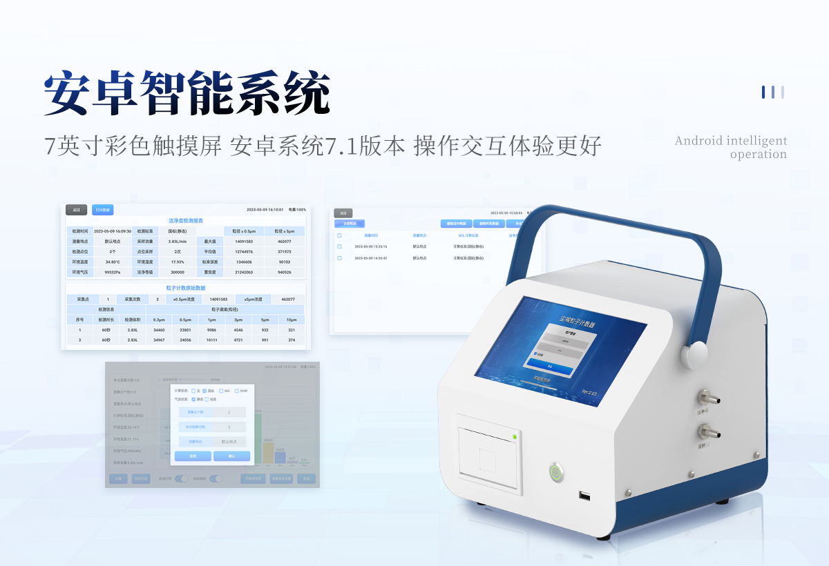 | 1、安卓系統(tǒng)7.1版本,操作交互體驗更好。 | 2、內(nèi)置溫濕度傳感器、環(huán)境氣壓傳感器 | 3、核心部件光散射傳感器明顯消除腔體的雜散光,信噪比大為提高。從而使測量更準(zhǔn)確更可靠。 | 4、按95%置信度(UCL)計算,計數(shù)結(jié)果可換算成m3和ft3 | 5、依照凈化級別劃分和規(guī)定,自動判定凈化級別,使用便利。 | 6、支持wifi、藍(lán)牙傳輸,數(shù)據(jù)可無線上傳;同時支持U盤拷貝數(shù)據(jù),免驅(qū)動插拔。 | 7、配置監(jiān)管平臺,檢測結(jié)果可直接無線傳至平臺,進行潔凈度長短期分析,輔助管理。 | 8、內(nèi)置新一代高速熱敏打印機,可選擇所需要打印的粒徑通道,靈活打印結(jié)果。 | 9、交直流兩用,內(nèi)置充電鋰電池,環(huán)保耐用可支持連續(xù)采樣6小時以上。 | 10、便捷簡易伸縮式云臺支架,安裝采樣操作更加方便。 |