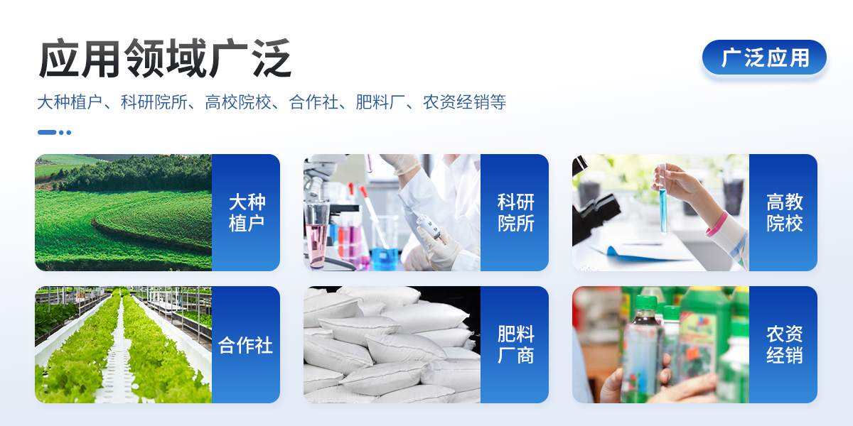 | 1、土壤養(yǎng)分:●土壤銨態(tài)氮、土壤有效磷、土壤速效鉀、土壤硝態(tài)氮、土壤水解氮、土壤全氮、土壤全磷、土壤全鉀、土壤有機(jī)質(zhì)(丘林法)、土壤有機(jī)質(zhì)(浸提法)、土壤總有機(jī)碳、土壤碳氮比、PH值、含鹽量、水分?!裢寥乐形⒘吭兀和寥棱}、土壤鎂、土壤硫、土壤硅、土壤硼、土壤鐵、土壤銅、土壤錳、土壤鋅、土壤氯、土壤鉬。 | 2、肥料養(yǎng)分:●單質(zhì)肥:氮肥中銨態(tài)氮、肥料硝態(tài)氮、尿素氮、縮二脲、磷肥中磷、磷肥中水溶性磷、鉀肥中鉀;●復(fù)合肥全氮、復(fù)合肥全磷、復(fù)合肥全鉀;●有機(jī)肥全氮、有機(jī)肥全磷、有機(jī)肥全鉀、有機(jī)肥硝態(tài)氮、有機(jī)肥速效磷、有機(jī)肥速效鉀、有機(jī)肥酸解氮、有機(jī)質(zhì);●水溶性腐植酸(風(fēng)化煤)、水溶性腐植酸(褐煤)、水溶性腐植酸(泥炭)、游離態(tài)腐植酸(風(fēng)化煤)、游離態(tài)腐植酸(褐煤)、游離態(tài)腐植酸(泥炭);●水溶肥全氮、水溶肥全磷、水溶肥全鉀;●葉面肥全氮、葉面肥全磷、葉面肥全鉀;●各種肥料微量元素:肥料鈣、肥料鎂、肥料硫、肥料硅、肥料硼、肥料鐵、肥料銅、肥料錳、肥料鋅、肥料氯、肥料鉬。 | 3、鮮作物營養(yǎng):●作物硝態(tài)氮、作物銨態(tài)氮、作物磷、作物鉀;●作物中微量元素:作物鈣、作物鎂、作物硫、作物硅、作物硼、作物鐵、作物銅、作物錳、作物鋅、作物氯、作物鉬;●作物中硝酸鹽、亞硝酸鹽。 | 4、干植株營養(yǎng):●植株全氮、植株全磷、植株全鉀 | 5、煙葉營養(yǎng):●全氮、全磷、全鉀、還原糖、水溶性總糖、硼、錳、鐵、銅、鈣、鎂等20項(xiàng)。 | 6、水質(zhì)中:●銨態(tài)氮、水中磷、水中鉀、硝酸鹽、亞硝酸鹽、硬度、PH、鐵、銅、錳、鋅、硼、氯、硫、硅、鉬等 |