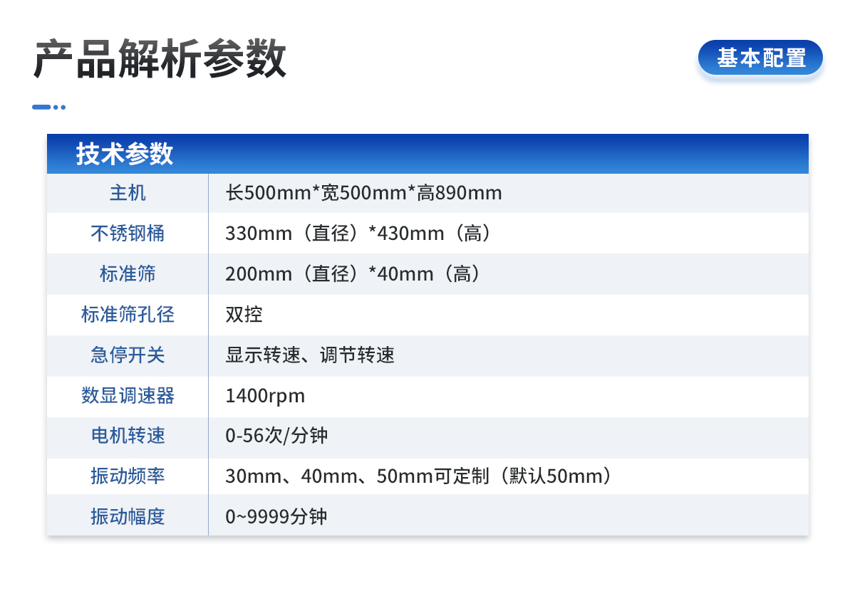 | 1、主機(jī):長500mm*寬500mm*高890mm | 2、不銹鋼桶:330mm(直徑)*430mm(高) | 3、標(biāo)準(zhǔn)篩:200mm(直徑)*40mm(高) | 4、標(biāo)準(zhǔn)篩孔徑:10mm,7mm,5mm,3mm,2mm,1mm,0.5mm,0.25mm。(可選配其他規(guī)格孔徑) | 5、急停開關(guān):雙控 | 6、數(shù)顯調(diào)速器:顯示轉(zhuǎn)速、調(diào)節(jié)轉(zhuǎn)速 | 7、電機(jī)轉(zhuǎn)速:1400 rpm | 8、振動頻率:0-56次/分鐘 | 9、振動幅度:30mm、40mm、50mm可定制(默認(rèn)50mm) | 10、計(jì)時(shí):數(shù)顯計(jì)時(shí)器 | 11、定時(shí)范圍:0~9999分鐘 | 12、電源:220V 50Hz 120W | 13、漏電保護(hù)器:10A |
