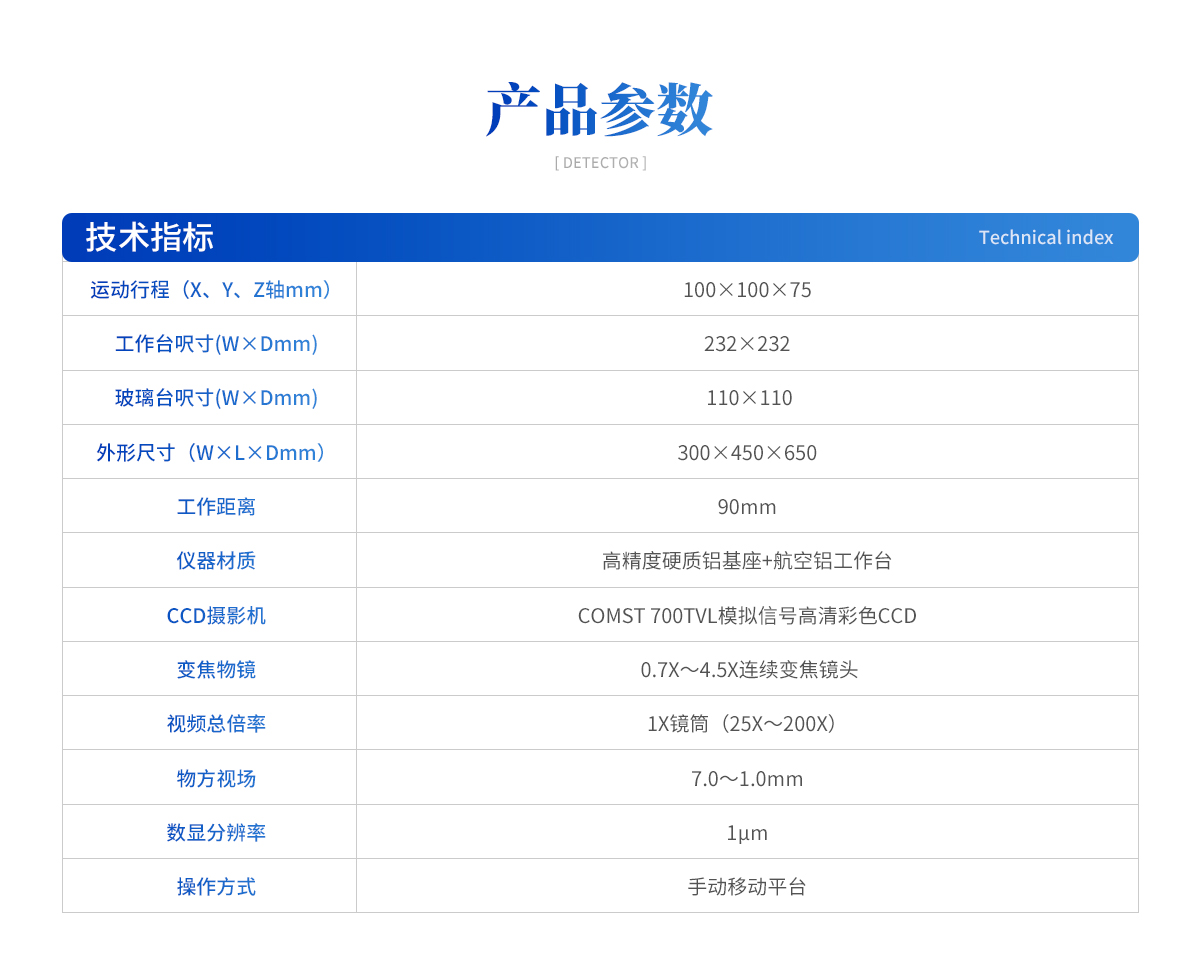 | 1、運動行程(X、Y、Z軸mm):100×100×75; 2、 工作臺呎寸(W×Dmm): 232×232 3、 玻璃臺呎寸(W×Dmm): 110×110 4、 外形尺寸(W×L×Dmm): 300×450×650 5、 工作距離:90mm 6、儀器材質(zhì): 高精度硬質(zhì)鋁基座+航空鋁工作臺 7、CCD攝影機:COMST 700TVL模擬信號高清彩色CCD 8、 變焦物鏡: 0.7X~4.5X連續(xù)變焦鏡頭 9、 視頻總倍率:1X鏡筒(25X~200X) 10、 物方視場: 7.0~1.0mm 11、 數(shù)顯分辨率:1μm 12、 數(shù)顯分辨率:1μm 13、 操作方式:手動移動平臺 |